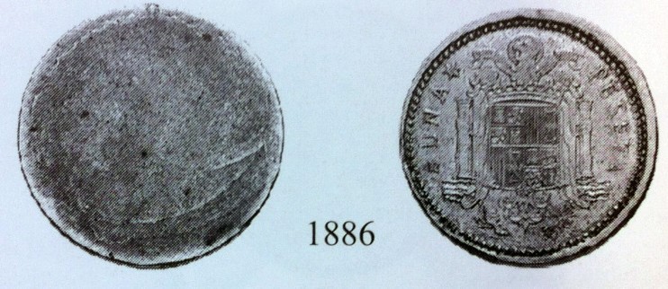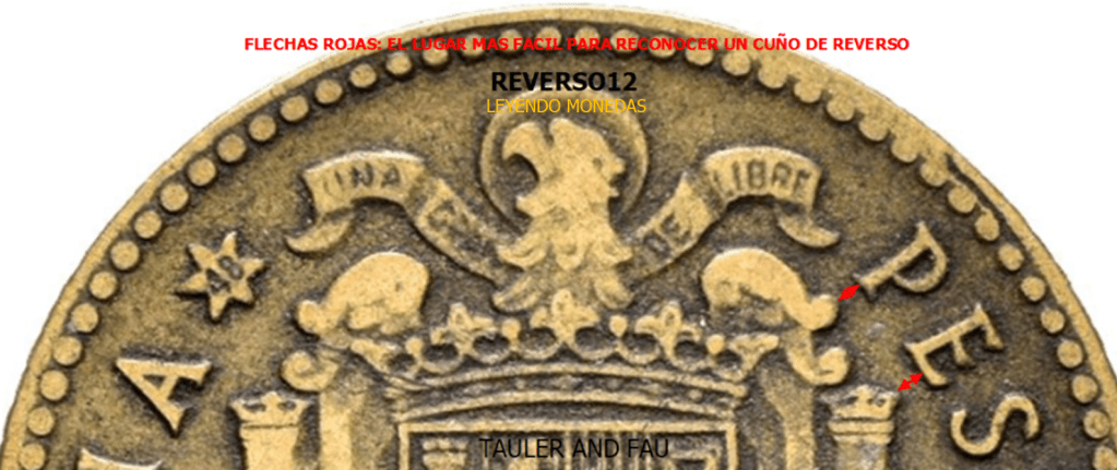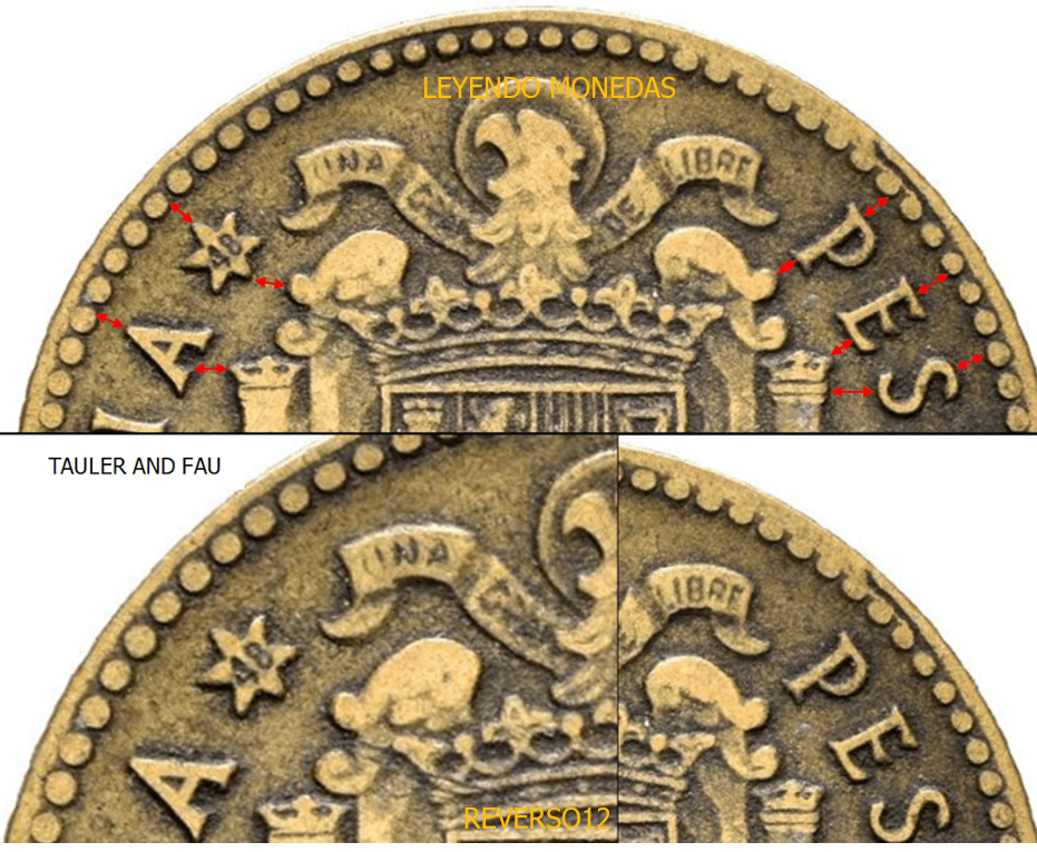 3. El Cuño de Reverso: El cuño de reverso de la peseta de 1946, es distinto al de todas las Pesetas acuñadas durante el periodo Franquista. Este punto sera matizado en la siguiente entrada del blog . 1 PESETA 1946*19-48 (Tauler and Fau). Hay que fijarse en la distancia (flechas) entre relieves, y en su posición/orientación (líneas).