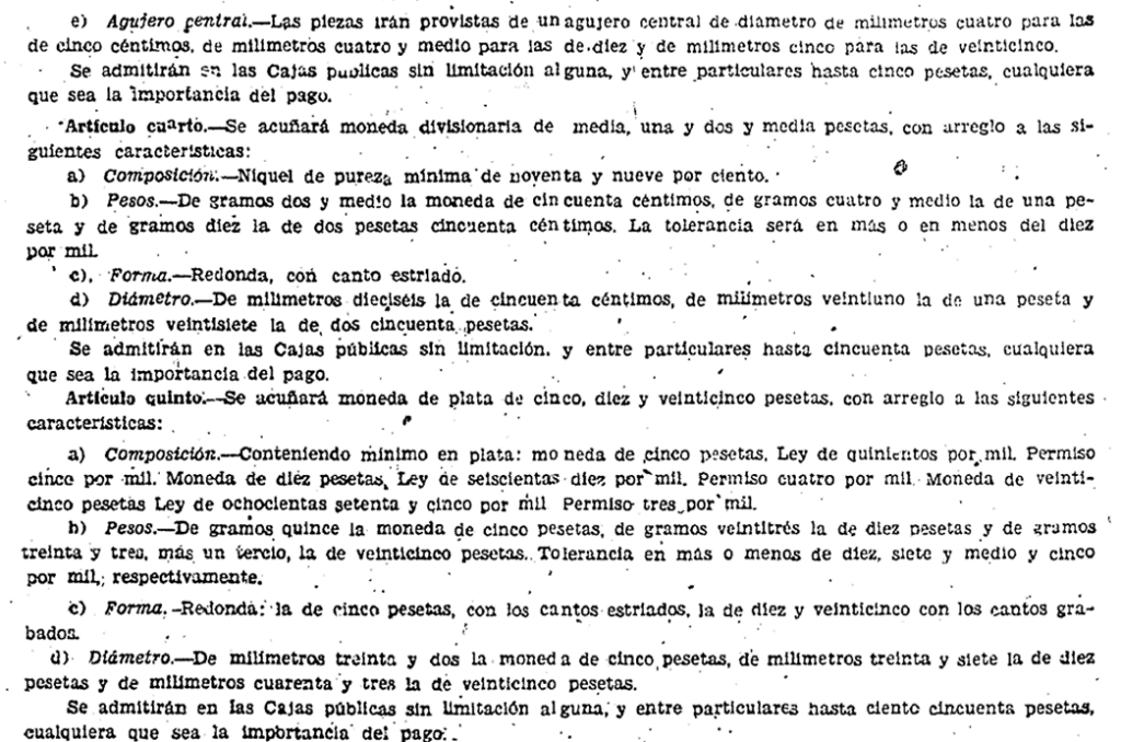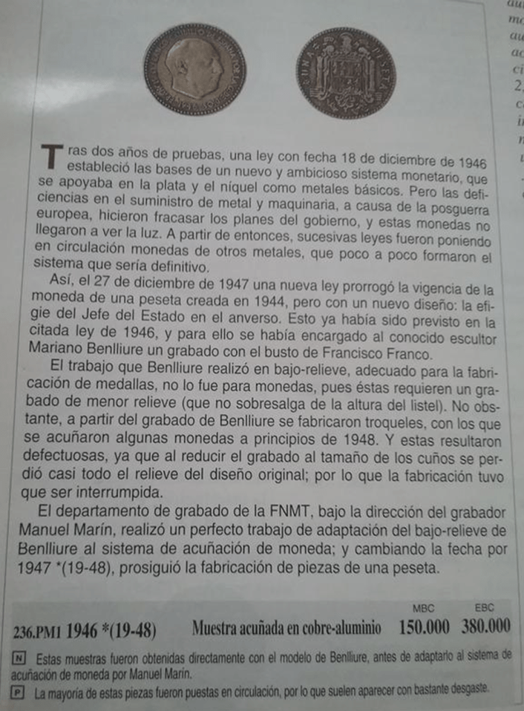 6) La peseta 46 en el artículo de Josep-María Valls I Font «El Busto de Benlliure» publicado en la Gaceta Numismática A.N.E. en septiembre de 1980, nº 58:Por lo que nosotros hemos logrado averiguar la fábrica abrió los cuños correspondientes a las monedas de 1, 2,50 y 5 pesetas y acuñó pruebas.Cuando descubrimos circulando la moneda de una peseta de 1946, se pretendió que era una falsificación. No obstante se confirmó nuestra teoría de que era una prueba oficial circulada, amparada por la Ley del 18 de diciembre de 1946, aprobada por las Cortes sobre cospeles correspondientes a la peseta de 1944. […]La maqueta esculpida por Benlliure fue elegida, entre otras, para figurar en el anverso de las acuñaciones del Estado Español, pero su excesivo relieve impidió su uso directo y para ajustarse a la amonedación tuvo que ser rebajado y desvirtuado en la máquina de reducir, lo que explica las diferencias existentes entre la efigie de la medalla, la de las pruebas del 1946 y la adoptada finalmente para todas las emisiones. […]Y la Ley del 18 de diciembre de 1946, de tan amplias miras, a pesar de su aprobación por las Cortes, de haber sobrepasado la fase de abrir cuños y de acuñar pruebas, quedó en suspenso como si nunca hubiese existido. Se necesitó una nueva Ley, la del 27 de diciembre de 1947, para que se emitieran las primeras monedas de una peseta con la efigie de Benlliure, modificada por el grabador don Manuel Marín, de la sección de Grabado de la Fábrica.