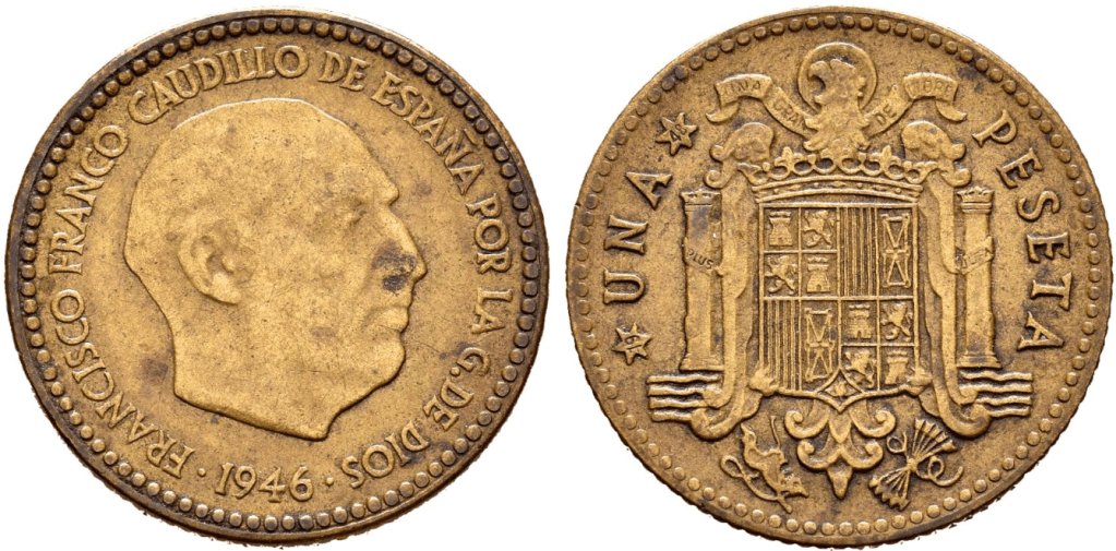 – Después de la peseta de 1944 a la que por motivos más que evidentes no se añadió el busto de Franco, la FNMT encargó a un anciano Benlliure, el más prestigioso de los escultores del tiempo, un modelo de busto para las nuevas series correspondientes al sistema monetario de 18 de Diciembre de 1946. El busto tuvo que ser reducido en su relieve; una vez realizada esta operación, se acuñaron unas piezas con el retrato para ver su apariencia.