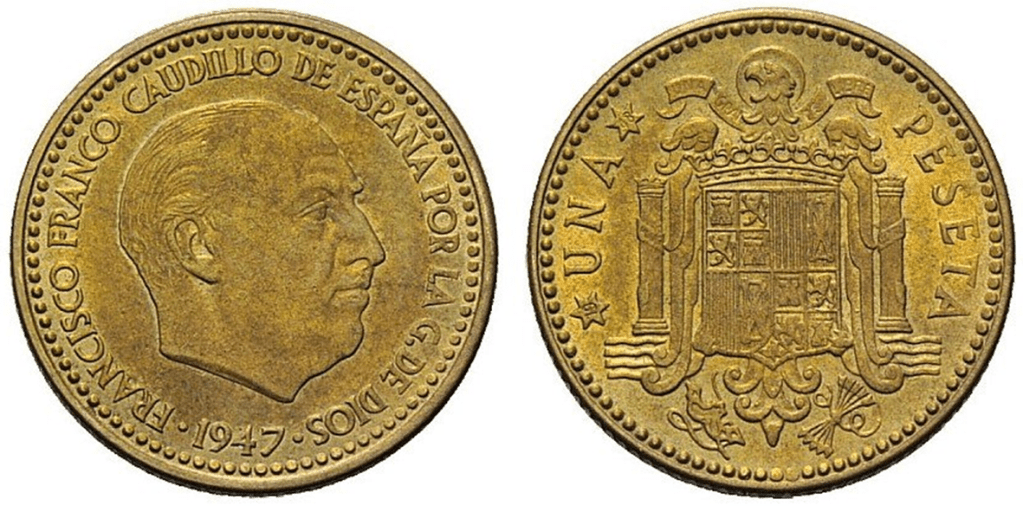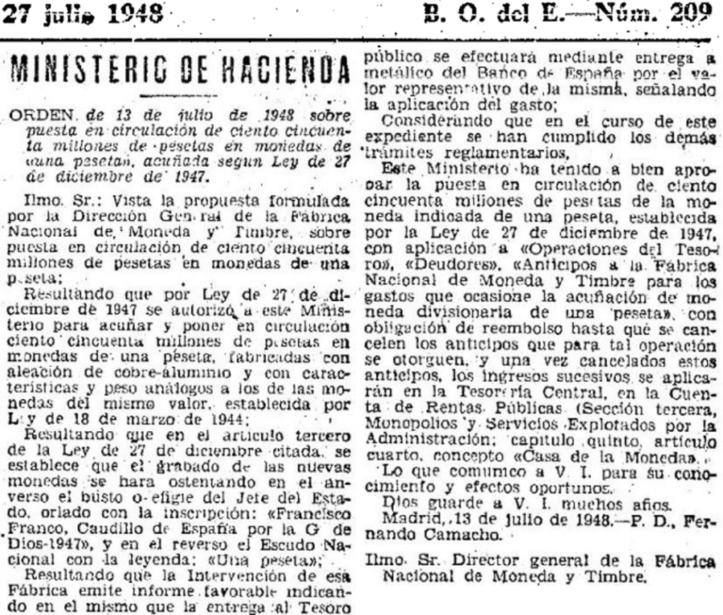 El BOE del 27 de Julio de 1948 habla de la puesta en circulación de las nuevas pesetas. La primera moneda con la efigie del jefe del estado.