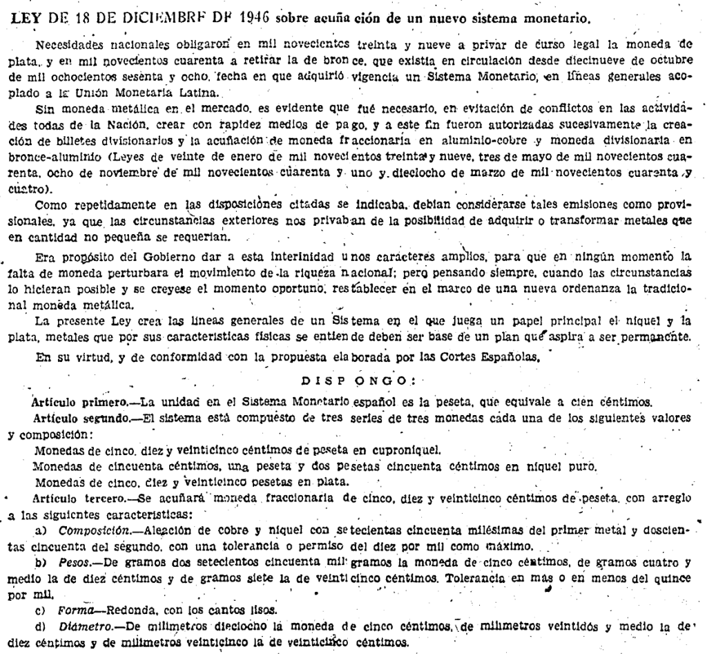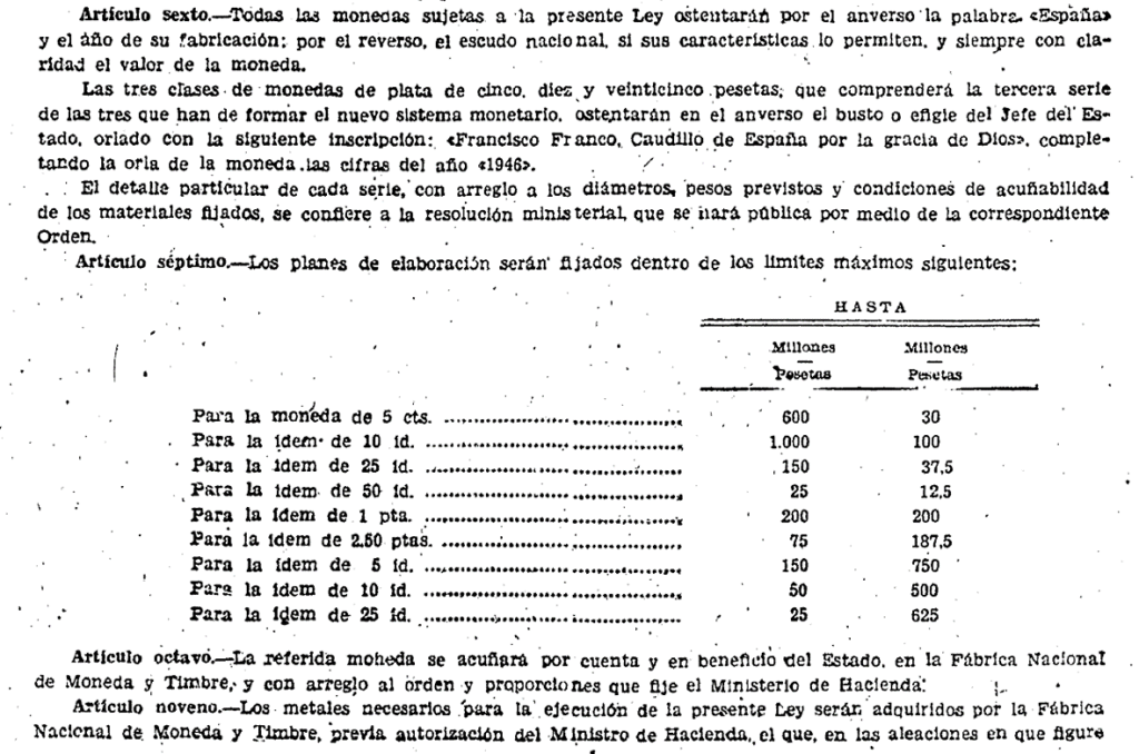 A finales de 1946, el Regimen Franquista quiere poner en marcha un Nuevo Sistema monetario. El BOE de diciembre, define dicho Sistema, y recalca la provisionalidad de las emisiones de moneda, tras el final de la guerra. El Jefe del Estado se siente fuerte en el poder, y quiere introducir su figura en las monedas (de plata). El proyecto era ambicioso, y por resumirlo en pocas palabras, no se pudo llevar a cabo. En algunas leyes posteriores, de emisión del circulante, se siguió referenciando a dicho sistema monetario, pero dichas emisiones no se adecuaron conforme a ley de 1946. A continuación el nuevo sistema monetario publicado en el BOE. En su articulo sexto, solo preveía busto en anverso de las monedas de plata. 1 Peseta en esta ley no era de plata. El busto en monedas de plata, no apareció hasta la emisión de las 100 Pesetas 1966.