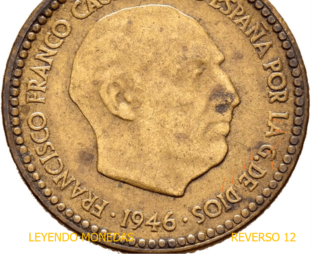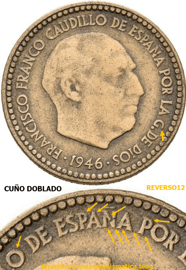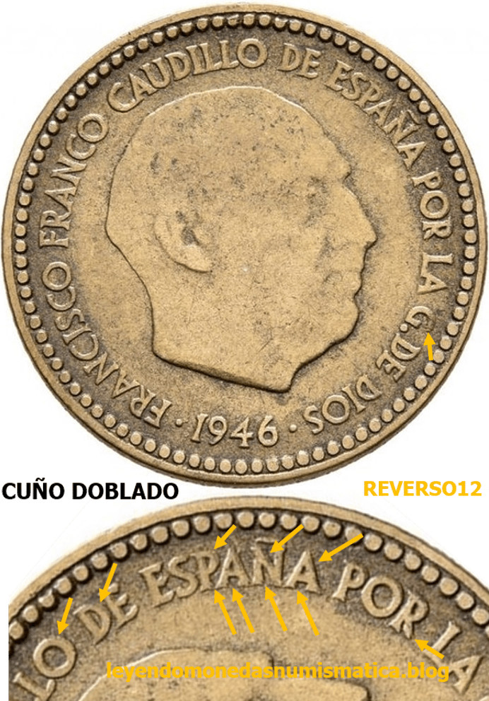 - El anverso 1 Peseta 1946 es un Cuño Doblado: donde mejor se aprecia esto, es en la leyenda alrededor del busto. La leyenda esta doblada ( mayor grosor y en relieve) y muchas de la letras tienen las típicas Muescas/faltas en sus esquinas.
