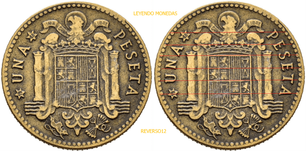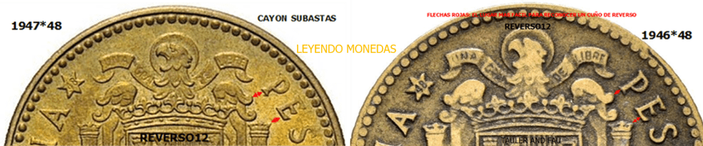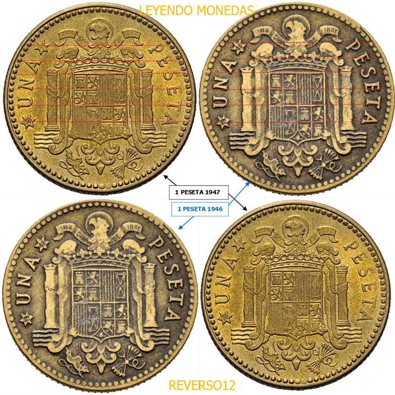 REVERSO 1 PESETA 1946*19*48. Al comparar ambos cuños, se aprecia la diferencia en posicion de los relieves. Puntos mas claros donde fijarse: