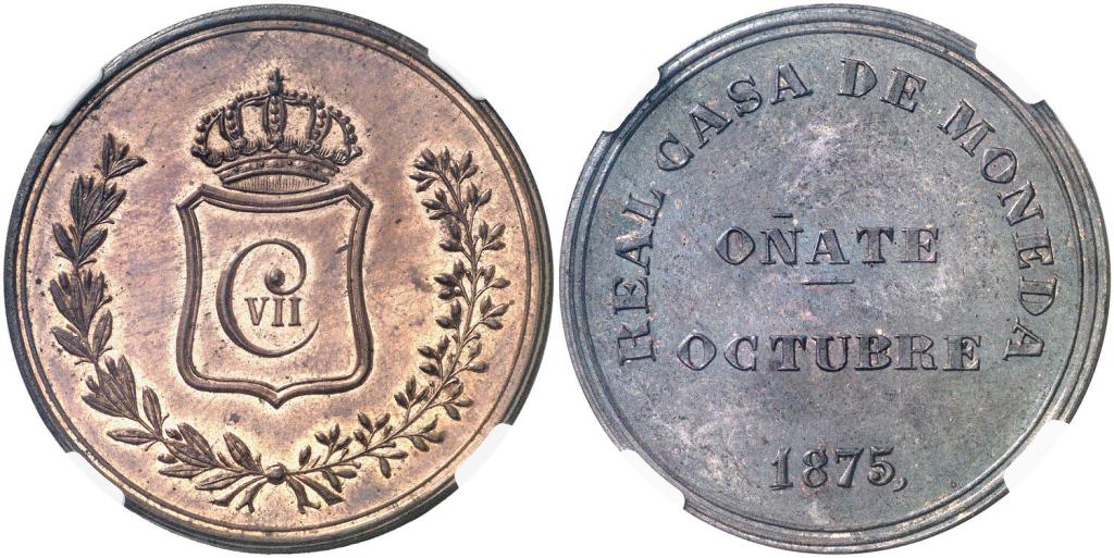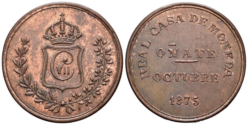 Los 5 y 10 Céntimos de Carlos VII, fueron acuñados en La Ceca de Oñate (Pais Vasco), durante la tercera Guerra Carlista. La Empresa familiar Hijos de Juan de Garay nació en la villa de Oñate, provincia de Guipúzcoa, en 1864. Cornelio Garay Zuazubiscar, joven emprendedor y con perspectivas empresariales, fundó una fábrica de fósforos y cerillas. Durante la tercera Guerra Carlista, la fábrica asumió el papel de Casa Real de la Moneda, acuñando monedas que incorporaban el escudo de Carlos VII. Oñate fue ocupada por los Carlistas a mediados de agosto de 1873, estableciéndose la villa, como sede administrativa. La Real Casa de la Moneda de Oñate, es inaugurada por Carlos VII en octubre de 1875, con la emisión en plata y cobre de unas Medallas conmemorativas, que reflejan el aconteci-miento en el reverso.