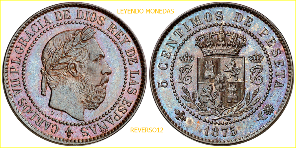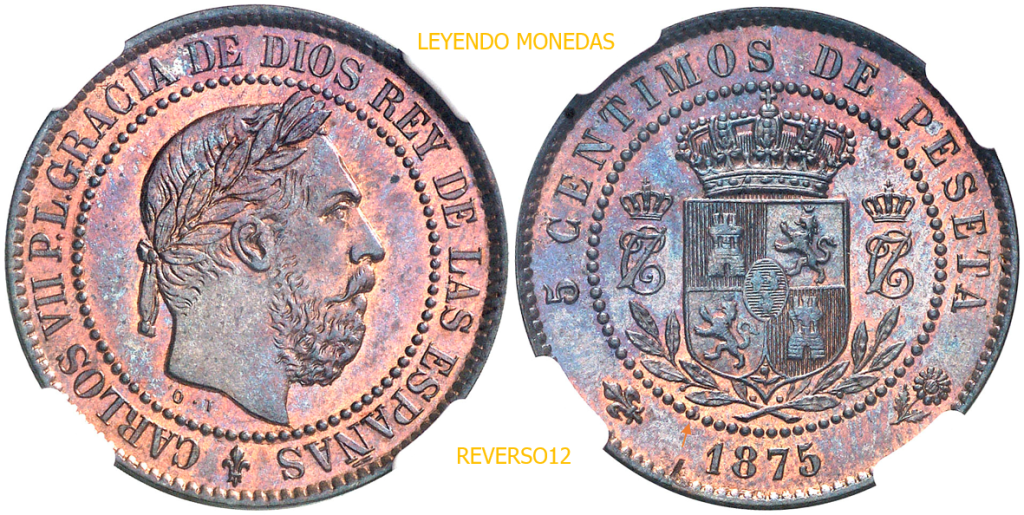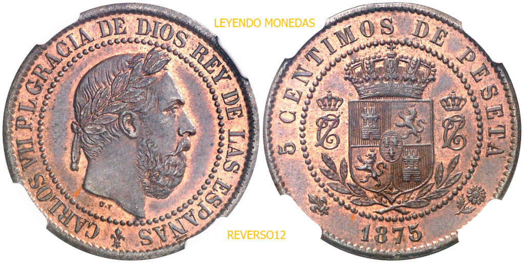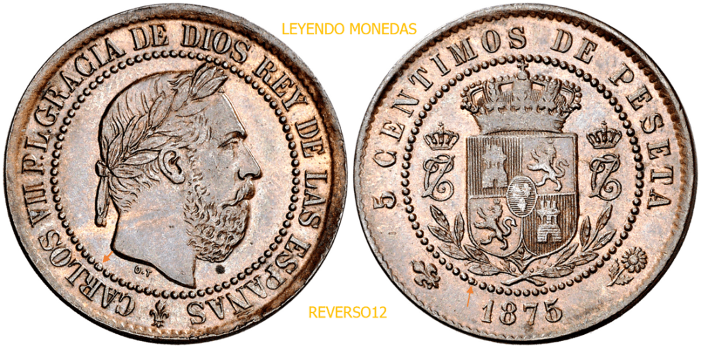 Tanto en los 5 Céntimos, como en los 10 Céntimos, aparece el rey (pretendiente), con la corona de laurel, propia del absolutismo. En la misma línea, está la leyenda CARLOS VII P. L. GRACIA DE DIOS REY DE LAS ESPAÑAS, titulación idéntica a la de los monarcas del Antiguo Régimen. El escudo situado en el reverso, es el anterior a la revolución de septiembre de 1868, ya que los carlistas pretendían recuperar la España tradicional, sin nada que tuviese que ver en algo con lo liberal. La Moneda de 5 céntimos 1875, Ceca de Oñate, con 5 gramos de peso y 25 milímetros de diámetro, esta fabricada en bronce. Su canto es liso, y su alineación (anverso/reverso) es moneda, es decir, la posición del reverso, es invertida respecto al anverso. Existe una variante con el reverso girado 180º. Variante, que en principio, seria debida, a un error en la colocación de los cuños. Anverso y reverso conservan la misma posición al girar sobre su eje vertical. Esta variante constituye el 30% de la emisión total.