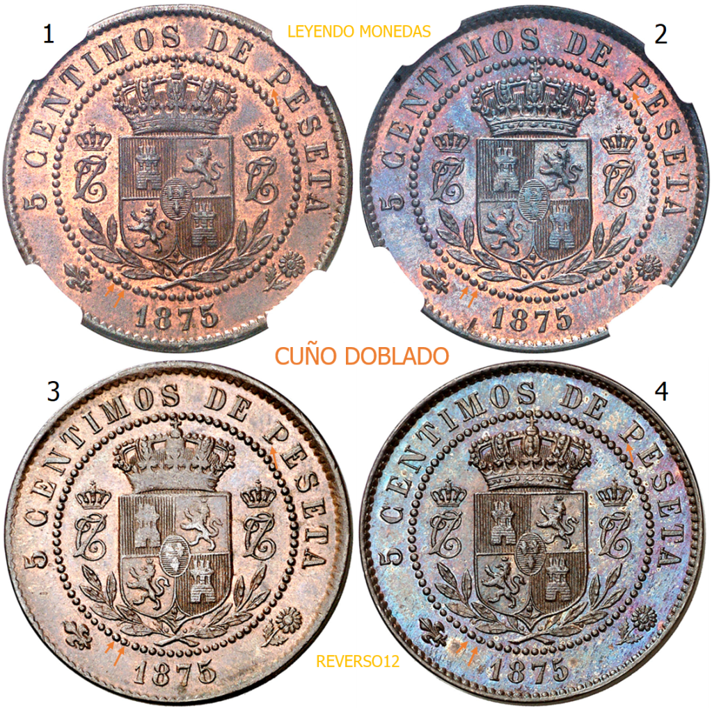 1) Cuño de anverso 1: O · T (siglas separadas) Cuño de Reverso: la flecha naranja señala un Cuño Doblado.
