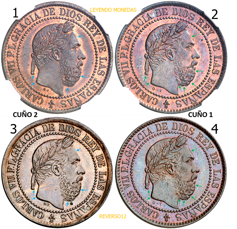 2) Cuño de Anverso 2: O·T (siglas juntas). La flecha naranja señala un Cuño Doblado. Cuño de Reverso: la flecha naranja señala un Cuño Doblado.