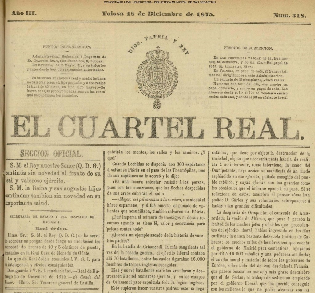 El 3 de Marzo de 1876, las tropas liberales entraban en Oñate y recibieron la orden de destruir la maquinaria de la Ceca. Existe una carta en la Real Academia de la Historia, de un anticuario de Bayona, que el 20 de diciembre de 1928, ofreció a la Academia de la Historia des matrices servant a fabriquer.