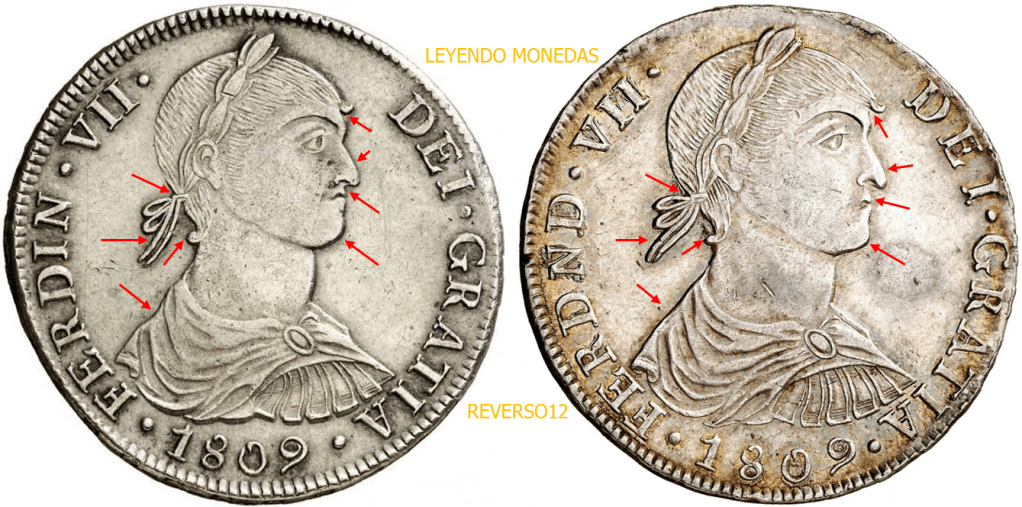 Aureo Marzo 2019, 1809. Fernando VII. Lima. JP. 8 reales. 26,61 gr. Segundo busto indígena con cabeza pequeña. FERDND. Rara y más así. EBC. Est. 500Comparando a) y b). las flechas señalan algunas de las diferencias mas evidentes, como la oreja, lazo, ceja, pelo,…