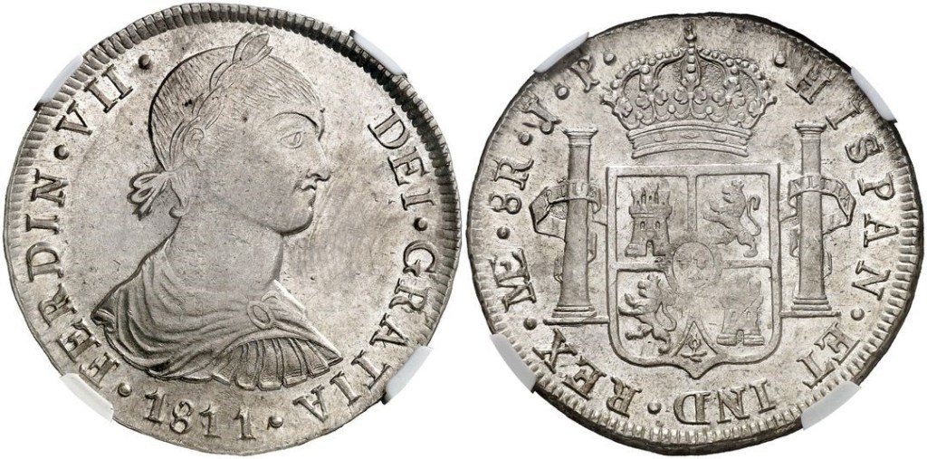 Aureo & Calicó Subasta 297. 18/10/2017. 1811. Fernando VII. Lima. JP. 8 reales. (Cal. 476). 26,62 g. Busto indígena. MBC+.Aureo & Calicó Subasta 345. 13/02/2020. 1811. Fernando VII. Lima. JP. 8 reales. (Cal. 476). Busto indígena. En cápsula de la NGC como MS62. EBC.