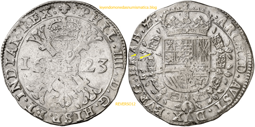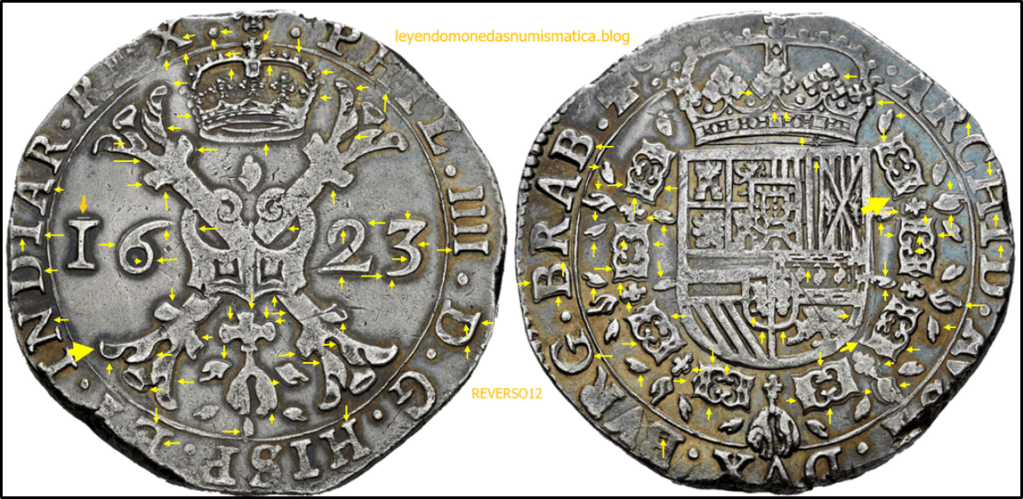 Las flechas amarillas, señalan donde el relieve circular se rompe, se desplaza y se inte-rrumpe, no es continuado, como en principio, esta diseñado (huecorrelieve) en el cuño. Esto es fruto del movimiento del cuño durante la acuñación a martillo. Este punto, delata en principio, que la moneda fue acuñada a Martillo. No es difícil encontrar monedas acuñadas a Martillo, con este error de acuñación. Si se hubiera movido o desplazado el cospel, en principio, afectaría a las dos caras de la moneda.