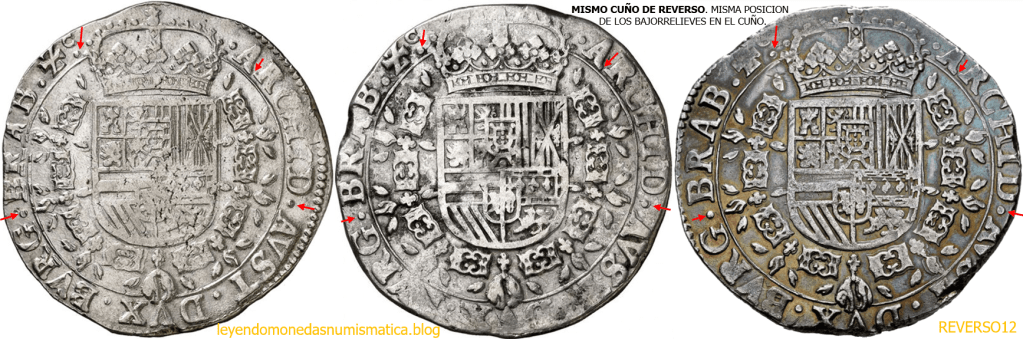 El cuño Móvil debería ser el que acuña el Reverso del Patagón. Y el Anverso del Patagón debería ser el cuño fijo. Sin embargo, hay tres piezas con diferentes anversos y mismo Reverso. Es posible que un cuño Móvil aguante/dure, mas que tres cuños fijos?. En principio no. Aunque es factible, que dos de los cuños de anverso ( fijo ) se rompieran pronto, durante su uso. Pero y si no ocurrió así?. Hipótesis del intercambio de cuños durante acuñación. La acuñación a martillo es una acuñación artesanal, manual,… el factor humano es impor-tante. Podría ser, que hubiera varios Cuños de Reverso, o mas de un operario acuñando cospeles. Y durante un descanso, final de la jornada, …se intercambian los cuños móviles, en la reanudación de la acuñación. Hay dos, tres,…. cuños preparados u operarios, y se continua la acuñación con otro Cuño Móvil diferente, al previamente utilizado. Cuando se rompe el Cuño Fijo, se prepara un nuevo Cuño Fijo, y se utiliza para golpear, uno de los Cuños de Reverso utilizado antes con otro cuño Fijo. El cuño de Anverso aparece en las monedas con diferentes Cuños de reverso. Pero también aparece en las monedas, el mismo Cuño de Reverso con diferentes Cuños de Anverso.