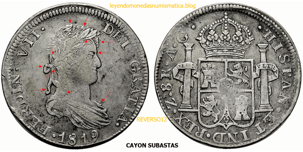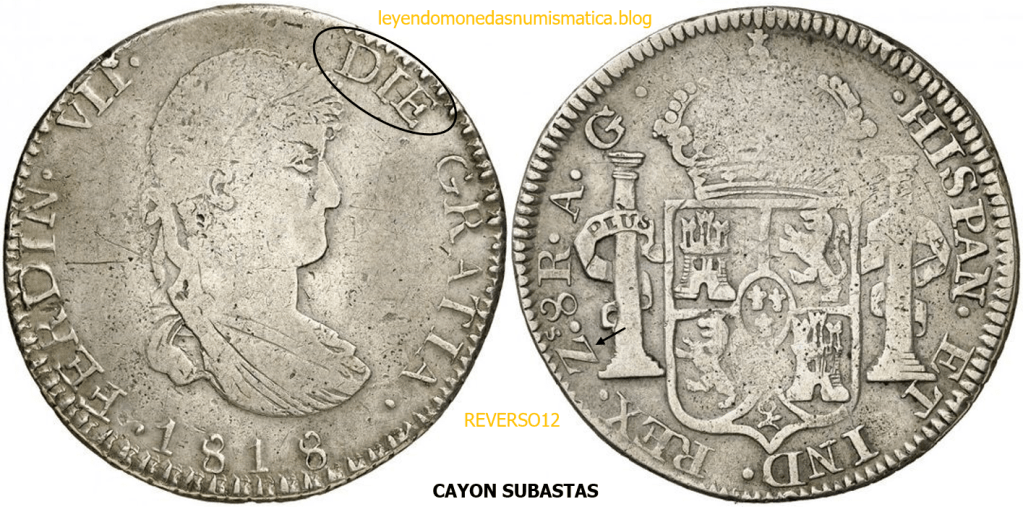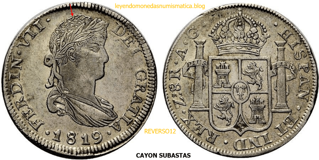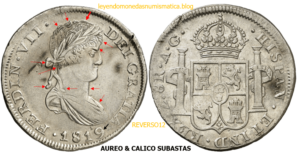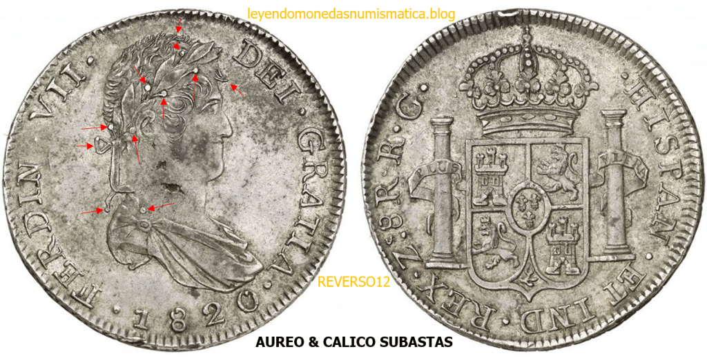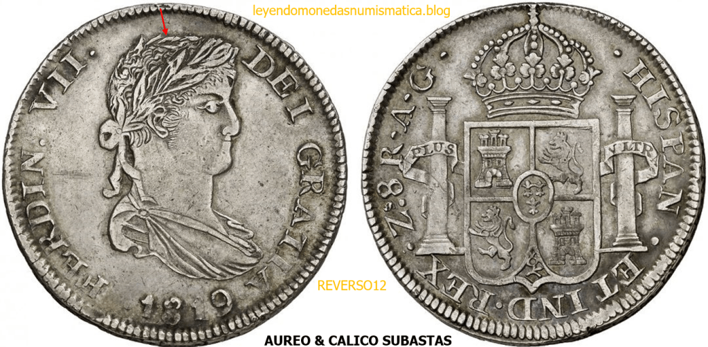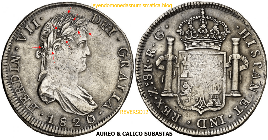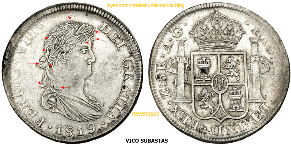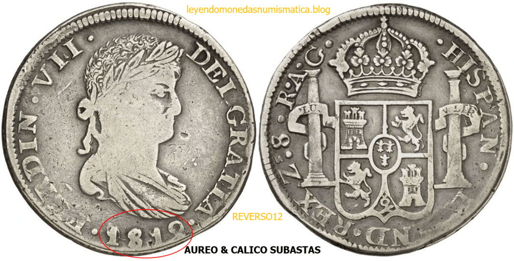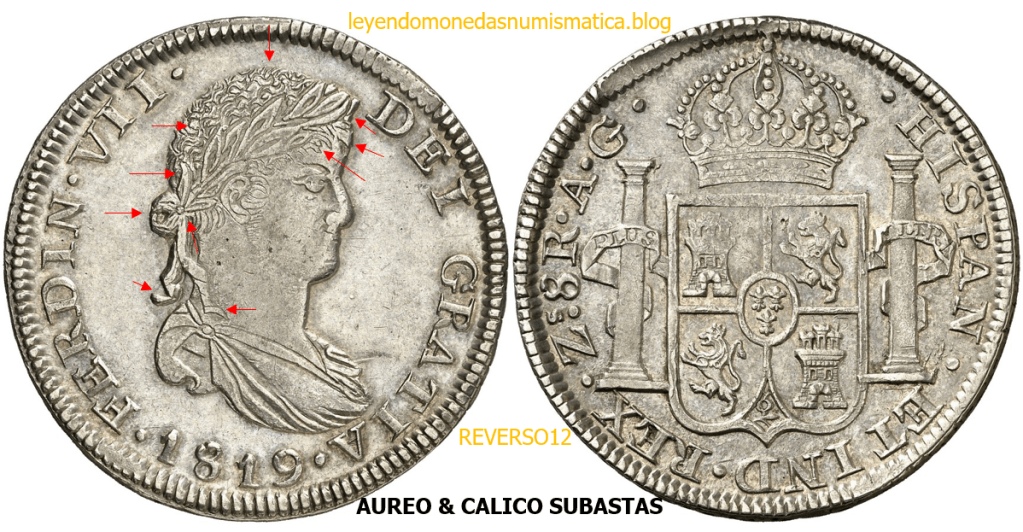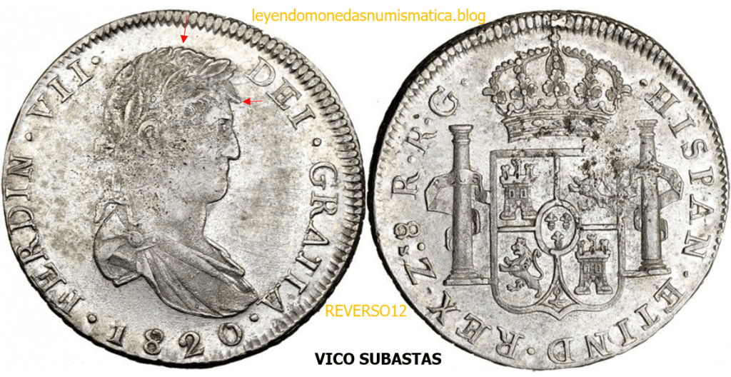 Con fecha 1822, se acuño, el ultimo Real de a 8 con el Busto de Fernando VII. Se trata de una ceca y de un período difíciles de estudiar, con graves dificultades para acuñar moneda, de ahí la cantidad de variantes, diferencias y problemas de acuñación. Hay diferencias en las letras, su diseño, tamaño, errores en la leyenda, errores de hincado,…8 REALES FERNANDO VII ZACATECAS. ELABORACION DEL CUÑO. En el busto suele haber bastantes variantes, sobre todo en las perlitas ( posición y diseño) de la diadema (los madroños de la laurea). También hay diferencias por el hincado del Busto (punzón), a veces no coincide el Hincado ( Cuño doblado). Otras, hay retoques por un mal hincado, una posición incorrecta del busto en el cuño, retoques en el cuño, por reutilización de cuños (cuños gastados, aprovechamiento de cuños…). Igualmente, la acuñación del cospel, puede dar lugar a diferencias en los relieves, debido a factores como la presión/funcionamiento/ mantenimiento de la maquina, la maleabilidad del cospel, ( aleación, calentamiento, grosor,…),… Las piezas acuñadas con anterioridad a 1819 suelen estar bastante mal acuñadas. A continuación, veremos algunas de las piezas acuñadas en La Ceca de Zacatecas desde 1810 a 1820.