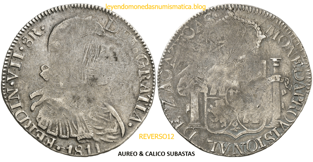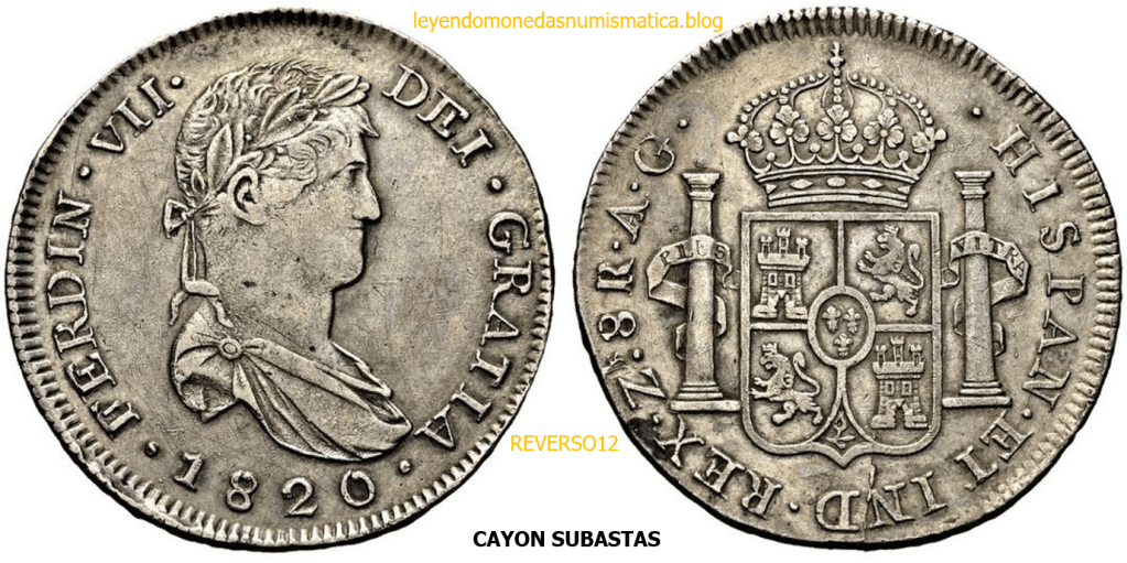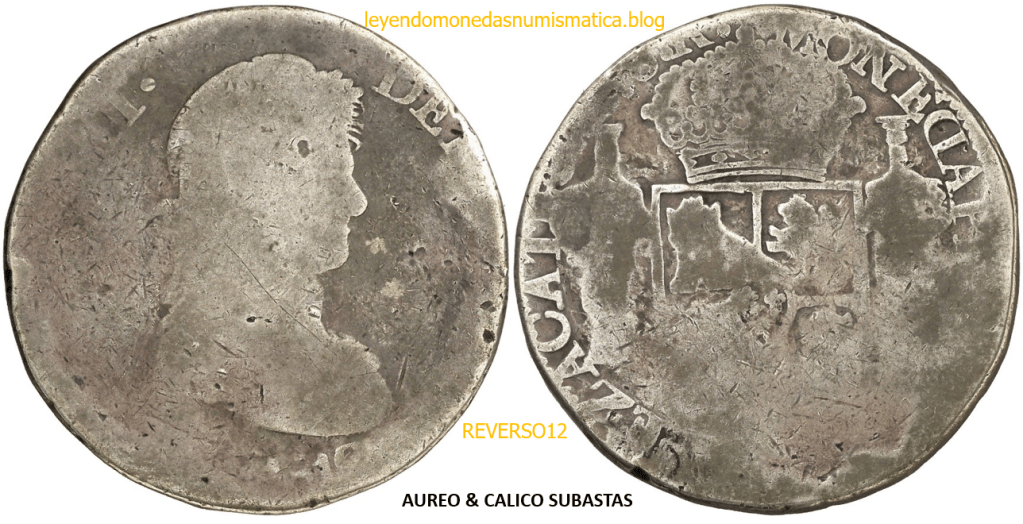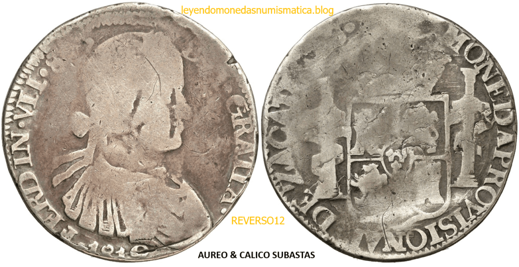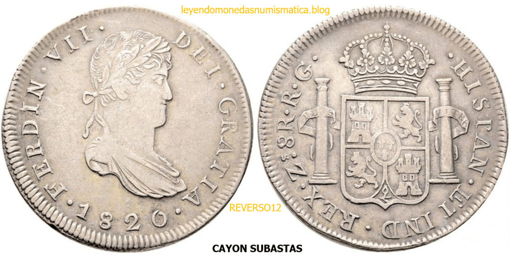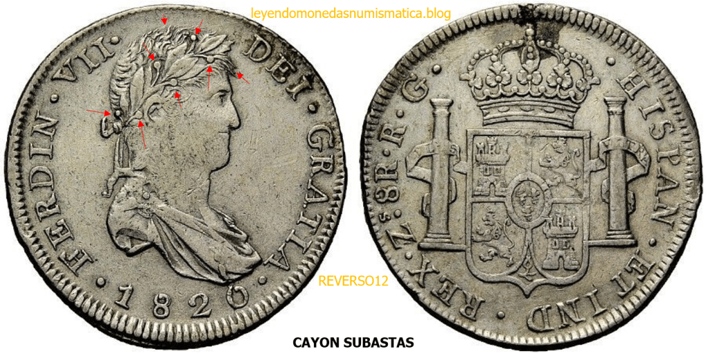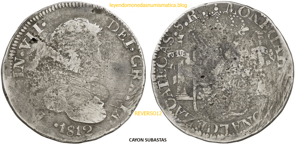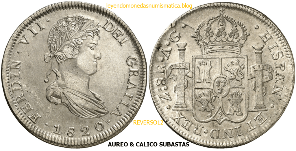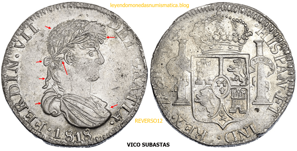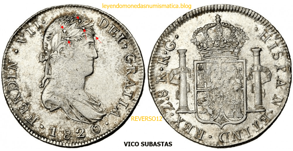 Con fecha 1822, se acuño, el ultimo Real de a 8 con el Busto de Fernando VII. Se trata de una ceca y de un período difíciles de estudiar, con graves dificultades para acuñar moneda, de ahí la cantidad de variantes, diferencias y problemas de acuñación. Hay diferencias en las letras, su diseño, tamaño, errores en la leyenda, errores de hincado,…8 REALES FERNANDO VII ZACATECAS. ELABORACION DEL CUÑO. En el busto suele haber bastantes variantes, sobre todo en las perlitas ( posición y diseño) de la diadema (los madroños de la laurea). También hay diferencias por el hincado del Busto (punzón), a veces no coincide el Hincado ( Cuño doblado). Otras, hay retoques por un mal hincado, una posición incorrecta del busto en el cuño, retoques en el cuño, por reutilización de cuños (cuños gastados, aprovechamiento de cuños…). Igualmente, la acuñación del cospel, puede dar lugar a diferencias en los relieves, debido a factores como la presión/funcionamiento/ mantenimiento de la maquina, la maleabilidad del cospel, ( aleación, calentamiento, grosor,…),… Las piezas acuñadas con anterioridad a 1819 suelen estar bastante mal acuñadas. A continuación, veremos algunas de las piezas acuñadas en La Ceca de Zacatecas desde 1810 a 1820.