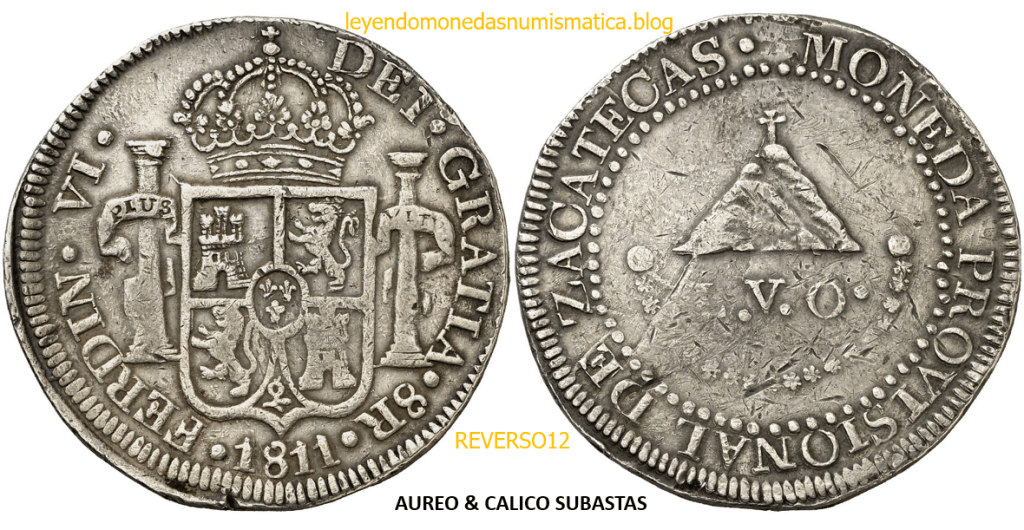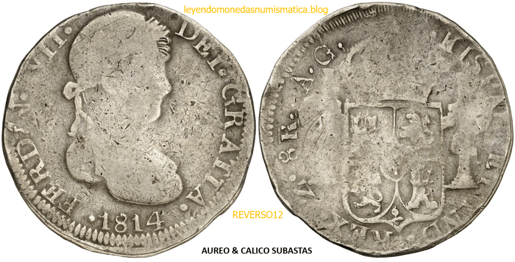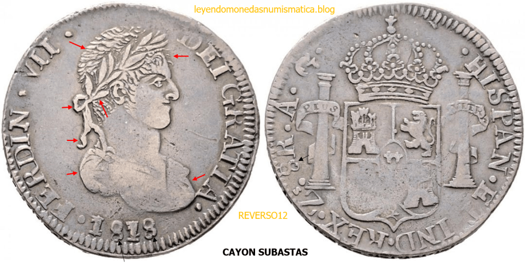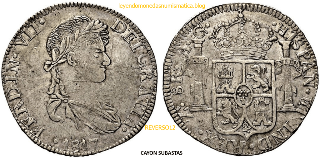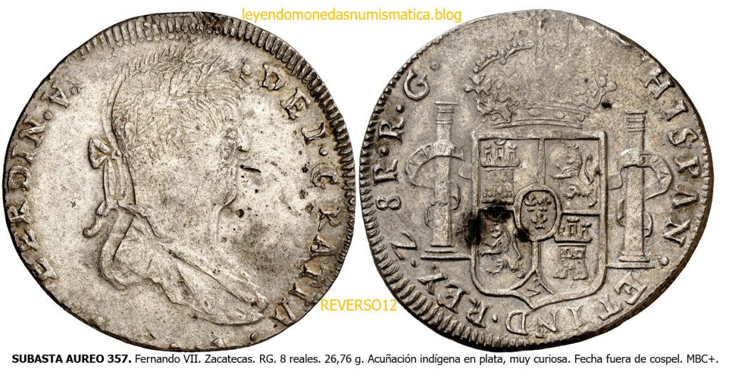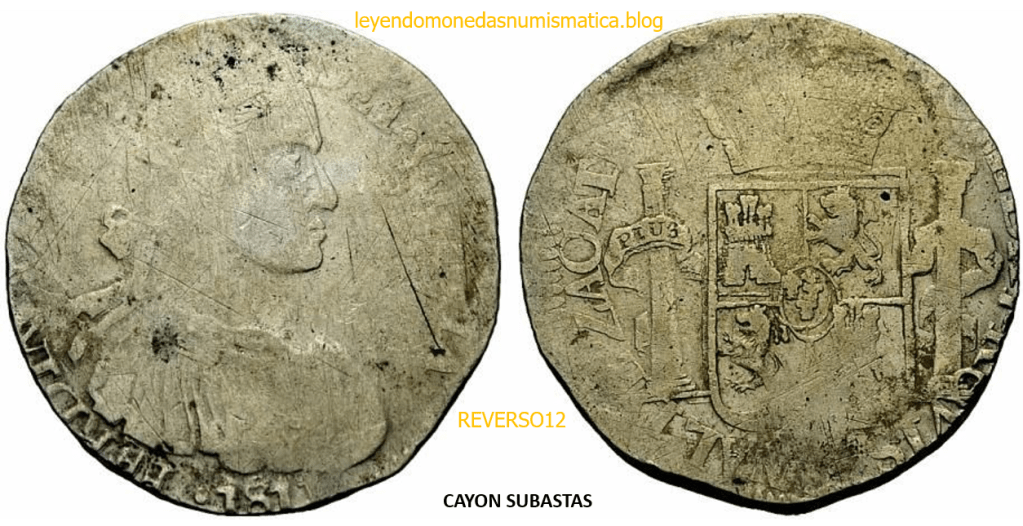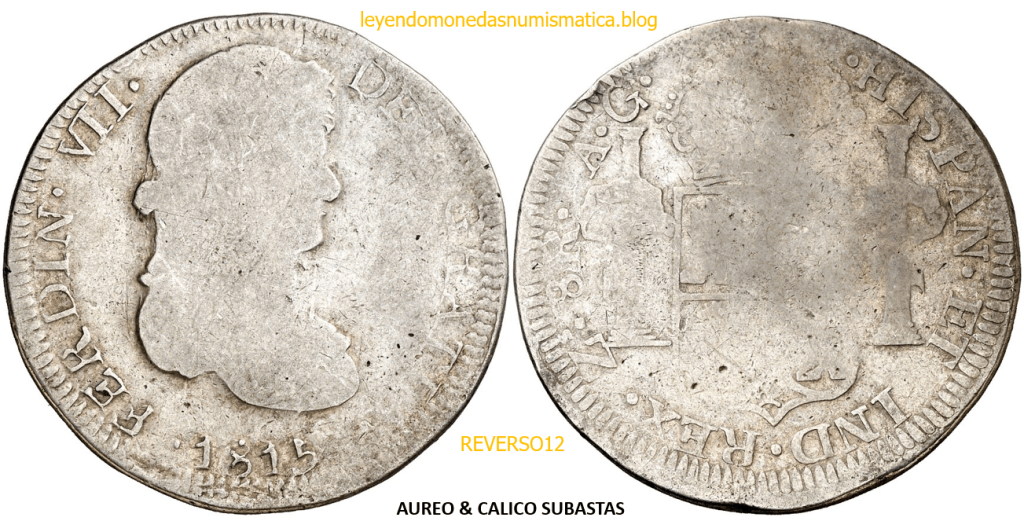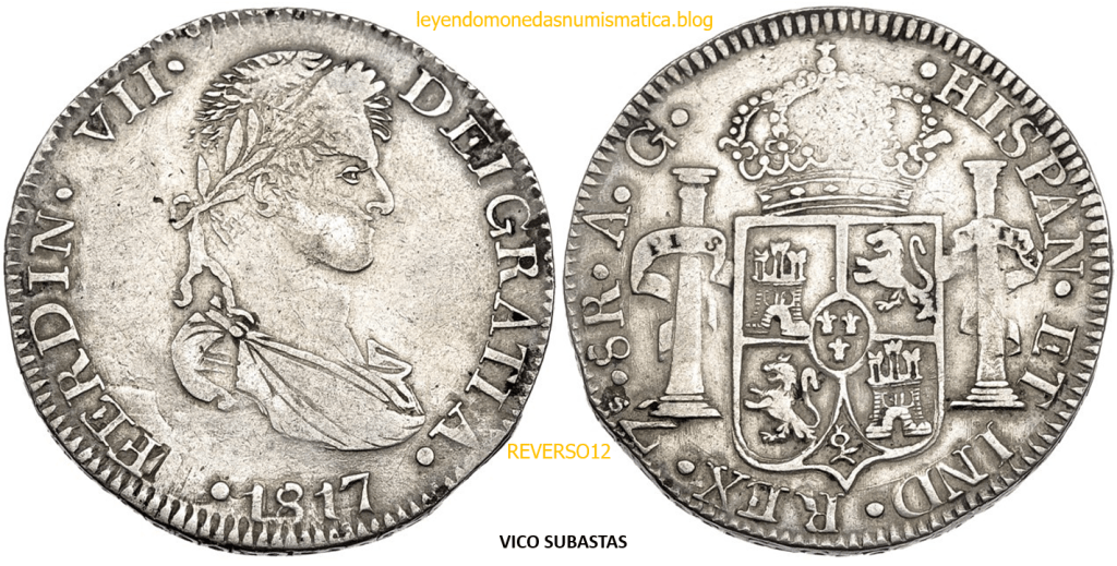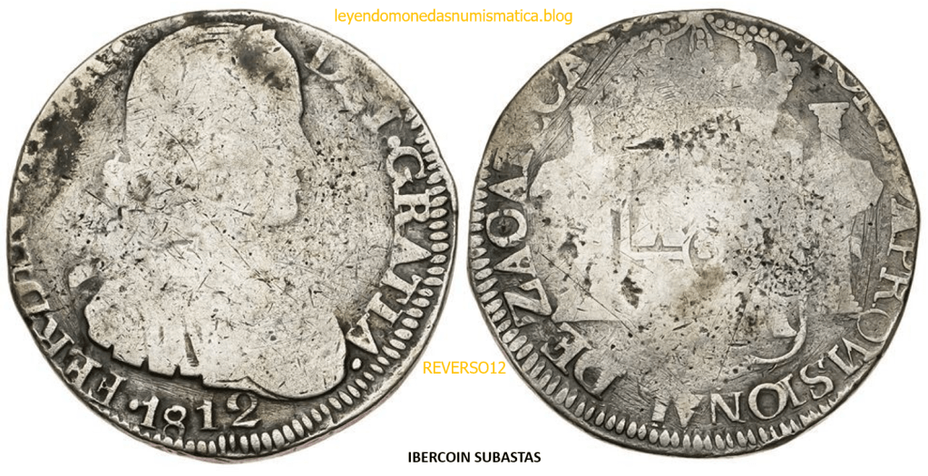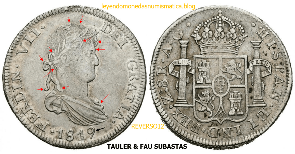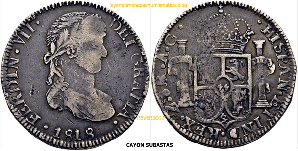 Con fecha 1822, se acuño, el ultimo Real de a 8 con el Busto de Fernando VII. Se trata de una ceca y de un período difíciles de estudiar, con graves dificultades para acuñar moneda, de ahí la cantidad de variantes, diferencias y problemas de acuñación. Hay diferencias en las letras, su diseño, tamaño, errores en la leyenda, errores de hincado,…8 REALES FERNANDO VII ZACATECAS. ELABORACION DEL CUÑO. En el busto suele haber bastantes variantes, sobre todo en las perlitas ( posición y diseño) de la diadema (los madroños de la laurea). También hay diferencias por el hincado del Busto (punzón), a veces no coincide el Hincado ( Cuño doblado). Otras, hay retoques por un mal hincado, una posición incorrecta del busto en el cuño, retoques en el cuño, por reutilización de cuños (cuños gastados, aprovechamiento de cuños…). Igualmente, la acuñación del cospel, puede dar lugar a diferencias en los relieves, debido a factores como la presión/funcionamiento/ mantenimiento de la maquina, la maleabilidad del cospel, ( aleación, calentamiento, grosor,…),… Las piezas acuñadas con anterioridad a 1819 suelen estar bastante mal acuñadas. A continuación, veremos algunas de las piezas acuñadas en La Ceca de Zacatecas desde 1810 a 1820.