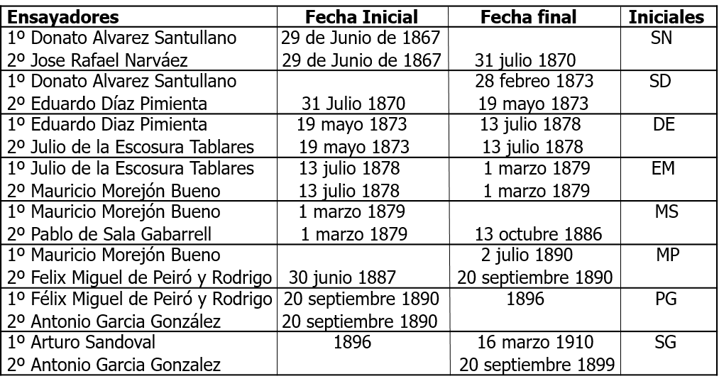 El decreto de 1868, establecía que todas las monedas acuñadas en plata, figurasen las iniciales/siglas de los funcionarios responsables de su ley (Ensayador) y de su peso (Juez de Balanza). Estas Siglas, grabadas en el reverso de las monedas de plata, nos serán útiles tanto para reconocer falsificaciones, como para determinar variantes de cuño (errores, rectificaciones,…). En todos los años, en que se produjo un cambio de ensayadores o de juez de balanza, existe la posibilidad de que se labrasen monedas con los grupos de iniciales anteriores y posteriores al cambio. Porque hay dos ensayadores?. En principio, por dos razones principalmente. Una, la de sustituir uno al otro cuando no estuviesen en la ceca, y la segunda razón, por contrastar/comparar el trabajo y evitar errores. Era un cargo muy importante, comprobar la ley de la plata. Un error tendría consecuencias fiscales y comerciales (económicas).