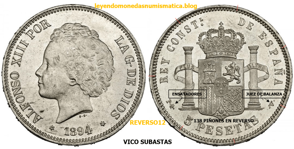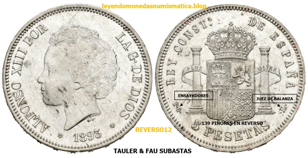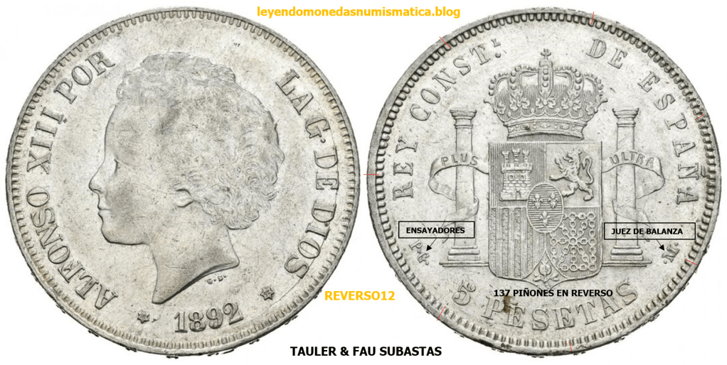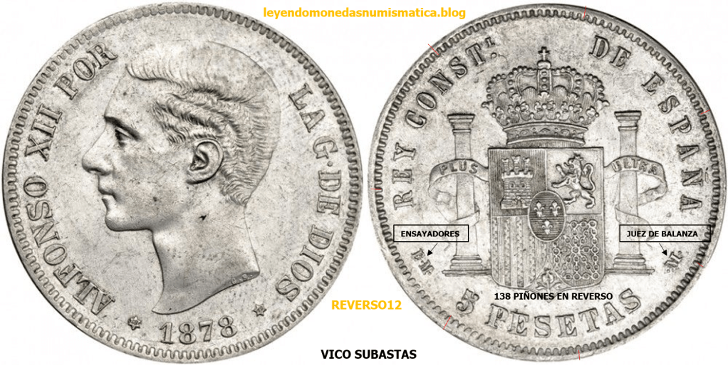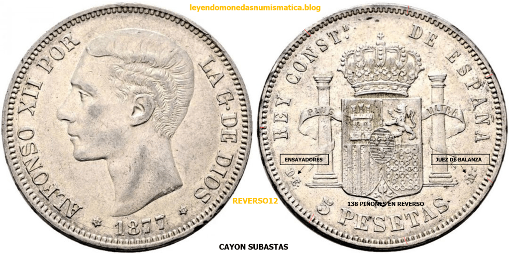El reverso, de los duros acuñados, en el periodo, que va desde el Duro 1877 DEM Alfonso XII hasta 1894 Alfonso XIII PGV, es el mismo. Cambian las siglas de los ensayadores y Jueces de balanza. Algunos reversos tienen diferente numero de piñones/perlas en la grafila. El primer duro acuñado con el nuevo reverso, a continuación.