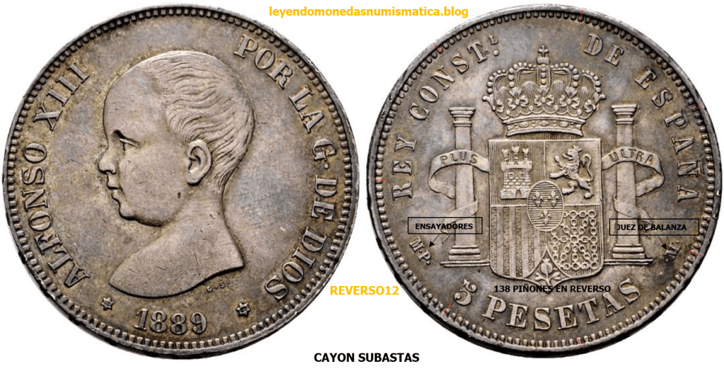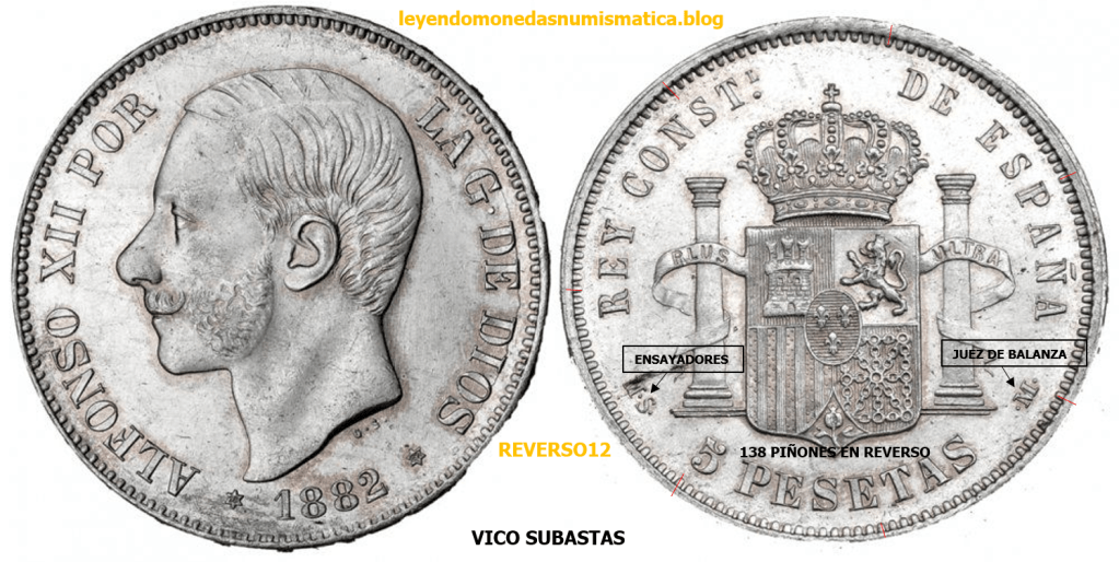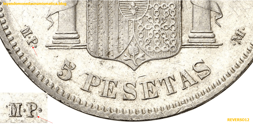 Que haya reversos rectificados sobre ensayadores DE, la lógica dice en principio, que sobraron cuños de las emisiones de 1877 y 1878 de Alfonso XII DEM, y que se aprovecharon posteriormente. Por ello encontramos rectificaciones de cuño en tiradas posteriores ( 1878, 1879, 1881, 1882, 1883, 1884,1885,1889, 1890).