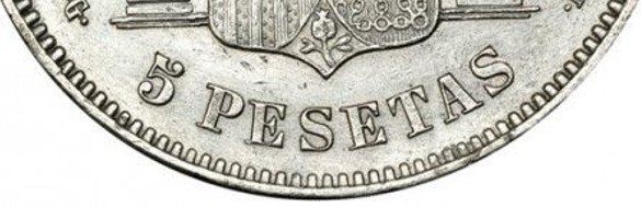 A parte del numero correcto de piñones o perlas, estos tienen que tener una forma/diseño característicos. Su forma seria, como la de un dedal redondeado en su parte superior. Salvo que haya errores de acuñación, como empaste, acuñación floja, ligero desplazamiento de la acuñación, cuño doblado, …el perlado debe ser, en principio, uniforme en forma y unido al listel. A continuación, el ultimo Duro acuñado, con el mismo reverso que empezó a utilizarse en 1977.