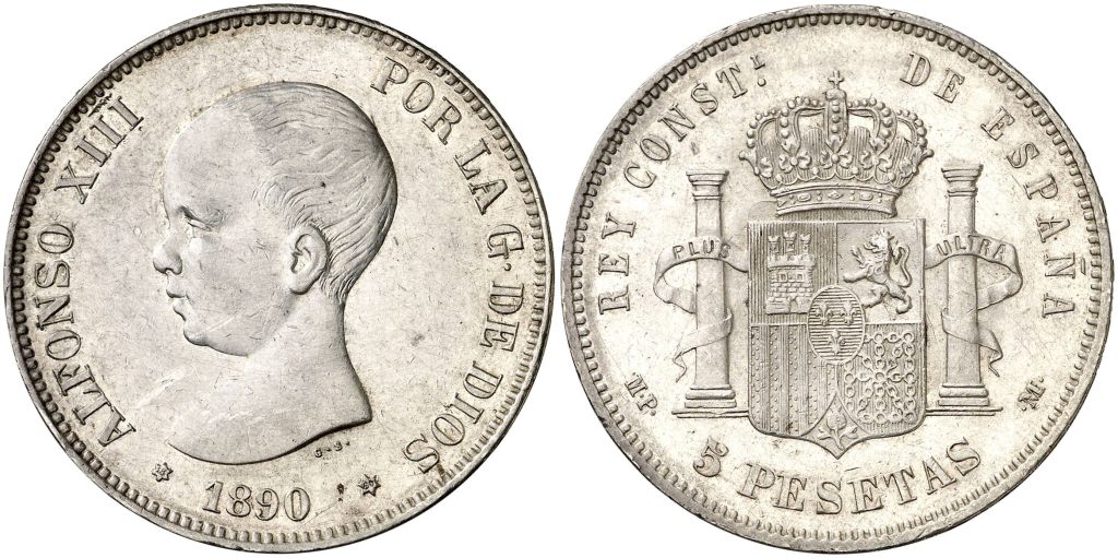 En 1896 cambia el diseño de Reverso de los duros de plata. Ya en 1895, se acuña el Duro 1895 PGV y el Peso de Puerto Rico. 5 Pesetas 1895*18-95. Alfonso XIII. PGV. Tupé.