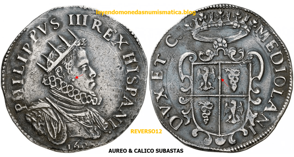 AUREO & CALICÓ Subasta 264. 11/12/2014. 1603. Felipe III. Milán. 1 Ducatón. (Falta en Vti. y Crippa). Rarísima. 31,91 gr. MBC+.