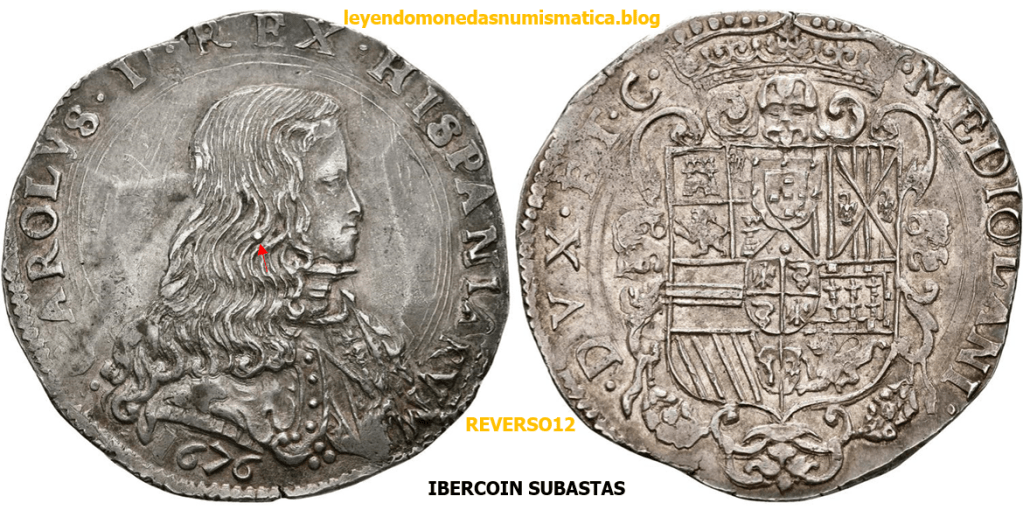 IBERCOIN Subastas. Enero 2019. CARLOS II. 1 Ducatón. 1676. Milán. Vti. 19; Crippa 3. Ar. 27,87gr. Pátina. Leves pruebas de metal en el canto. EBC.