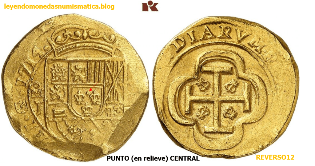 Dicho punto puede ser utilizado como distintivo de cuño (posición). Porque?. Aunque el punto este en el centro geométrico del cuño, los bajorrelieves en cada cuño estarán en distinta posición, por ello, dicho punto aparecerá en distinta posición sobre los altorrelieves de la moneda acuñada.