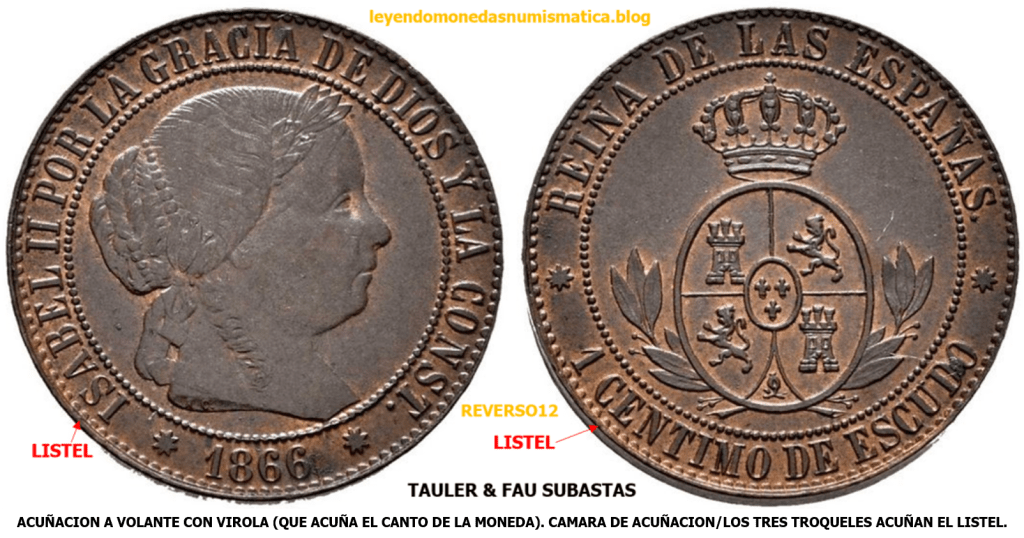 La Acuñación a Volante sin restricción de metal, daba lugar a piezas sin Listel. Ver El Flujo Radial del Metal, en la Leyenda (SIGLAS). Acuñación a Volante sin restricción de metal (sin Virola). La virola es un anillo, que contiene la expansión lateral del cospel en la acuñación a Volante. El diseño de la virola se transmite al canto de la moneda, por la fuerza del choque del canto del cospel. Los tres troqueles ( Troquel móvil, Troquel fijo y Virola), forman un espacio cerrado denominado cámara de acuñación. Una vez alojado el cospel en la cámara de acuñación, la presión del golpe del troquel móvil, hace que el flujo de metal en tres dimensiones (compresión) rellene los huecorrelieves de los tres troqueles. Hay dos tipos de virola: