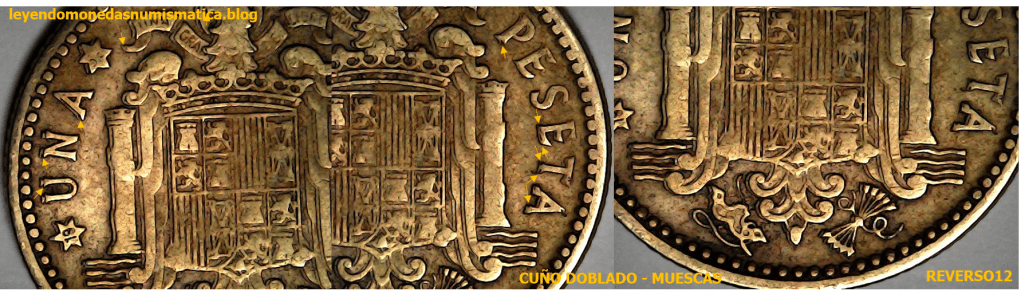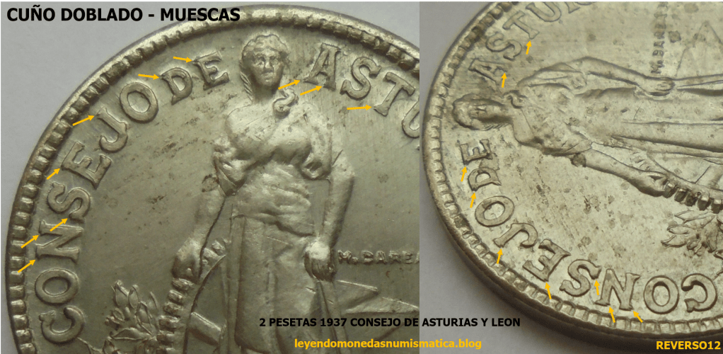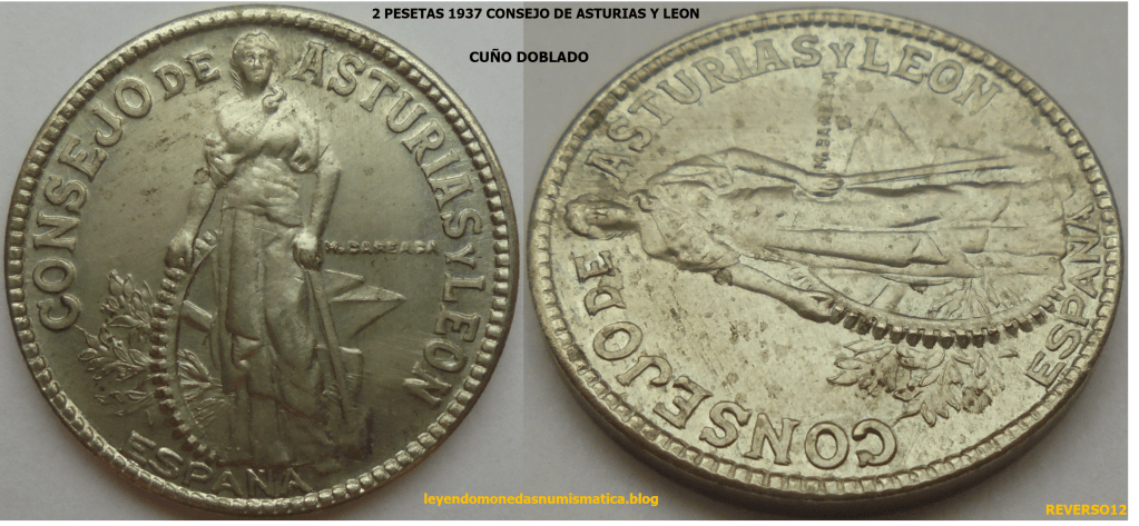 El error se produce en el cuño. El error esta en el cuño y por ello, todas las piezas acuñadas reflejaran ese error en magnitud y posición, siempre que no ocurran otros errores durante la acuñación. El error se produce durante el Hincado del Punzón de Trabajo. Hay hincados no coincidentes, durante el proceso de transmisión de improntas del Punzón al Cuño, que dan lugar, a que aparezcan contornos de los relieves doblados. Es lo que se conoce como CUÑO DOBLADO. Han aumentado los bajorrelieves del cuño. Se han doblado las improntas en el cuño. Otros Cuños Doblados – 1 PESETA 1947*(19-48). Estado Español. La ESTRELLA 48 en el proceso de acuñación. 1 PESETA 1937. CONSEJO ASTURIAS Y LEON. Dos CUÑOS DOBLADOS de Anverso.