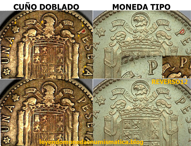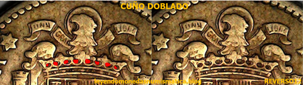 C) Menor tamaño de los bajorrelieves: En un Cuño Doblado, sucede lo contario que en una Doble Acuñación (casi) Coincidente. Los Bajorrelieves de la moneda acuñada con un Cuño Doblado, tienden a disminuir en tamaño. Solo los altorrelieves del Punzón de Trabajo pueden incidir en el cuño, si hay divergencia durante el Hincado. Ver imágenes anteriores, para comparar la moneda tipo y un Cuño Doblado, los trazos rojos, tanto en la corona, como en la P de PESET (trazo rojo).