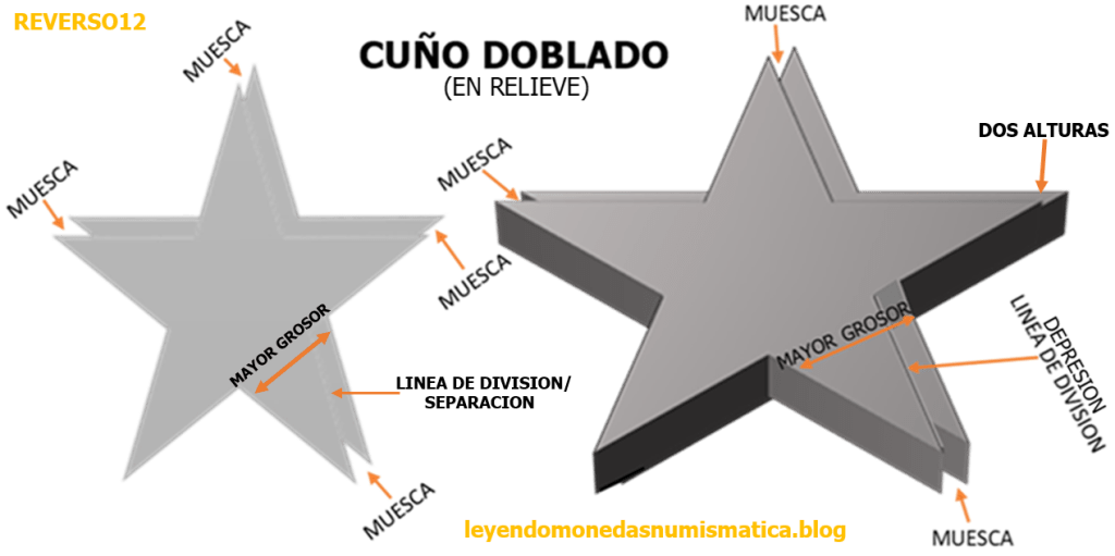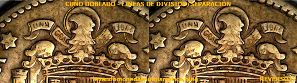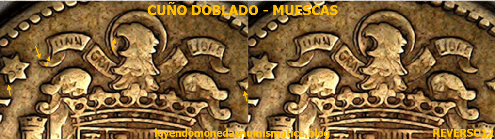 Las flechas naranjas, señalan los puntos mas evidentes donde los hincados del Punzón de trabajo son divergentes, no coinciden. Las flechas señalan las típicas áreas/faltas de metal de los Cuños Doblados. Estas MUESCAS se aprecian en las esquinas de los relieves de la moneda, consecuencia de los hincados no coincidentes del punzón de trabajo sobre el tocho de acero (cuño). Las muescas son la prueba de que ninguno de los relieves presentes en la moneda, (debido a la no coincidencia de los hincados del Punzón de Trabajo), surgen/ nacen uno del otro, como así sucede en una Doble Acuñación (casi) Coincidente, donde el relieve superior nace del relieve inferior (aplastado). Una Doble Acuñación casi Coincidente nunca presentara muescas en las esquinas de los relieves. Una Muesca es un detalle sencillo para descubrir un Cuño Doblado. Hay Cuños Doblados que no tienen Muescas, carecen de ellas las monedas.