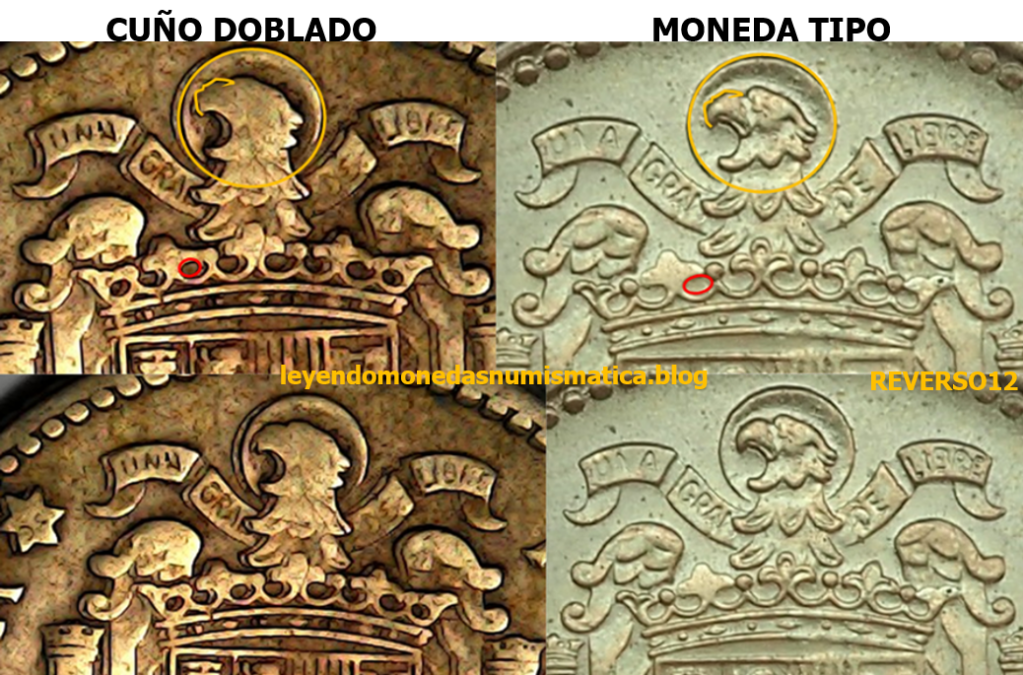 B) Mayor tamaño de los altorrelieves: así como la DOBLE ACUÑACION casi COINCIDENTE disminuye el tamaño de los relieves, un Cuño Doblado hace exactamente lo contrario. Un Cuño Doblado AUMENTA EL TAMAÑO DE LOS RELIEVES. Porque?. Porque los hincados no coincidentes del punzón de trabajo aumentan los bajorrelieves del cuño. En el cuño aumentan esos bajorrelieves que luego serán los altorrelieves de la moneda. Ver el circulo naranja, en la imagen, que corresponde en tamaño, con el relieve circular exterior (de la cabeza del águila), de la moneda Tipo.