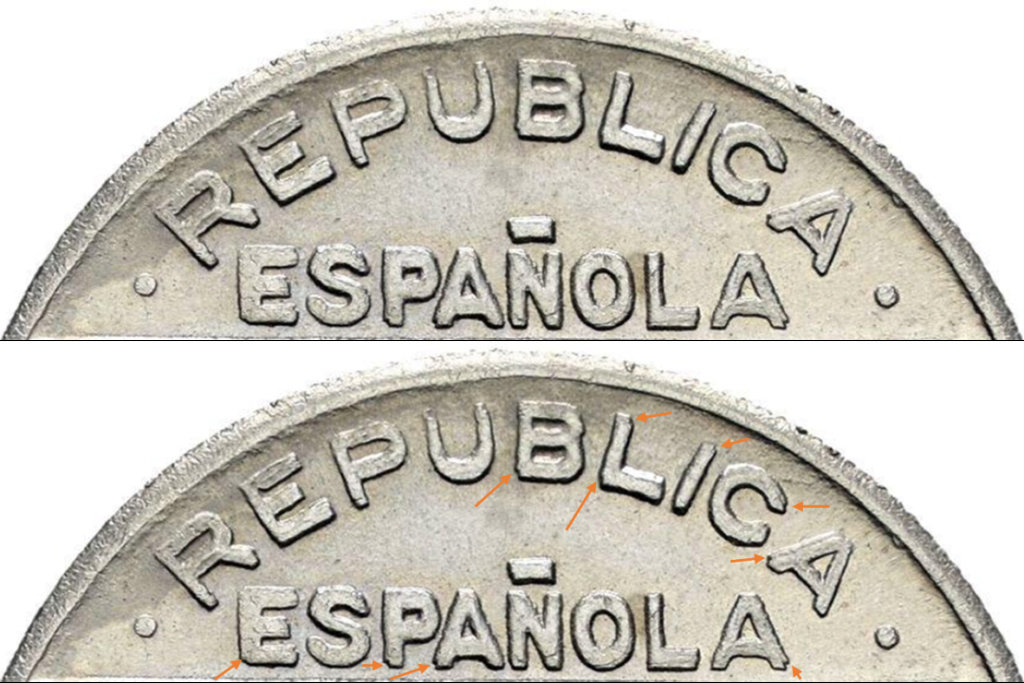 Hay mayor tamaño en los relieves, se aprecia en las letras de la leyenda y en la Dama. La Dama es mayor en tamaño (GROSOR). Sus brazos y manos son un punto evidente de ello. Hay igualmente, líneas de división en algunas siglas de la leyenda. Pero lo mas evidente, y lo mas sencillo, para reconocer un Cuño doblado son las MUESCAS. A continuación señalo algunas.