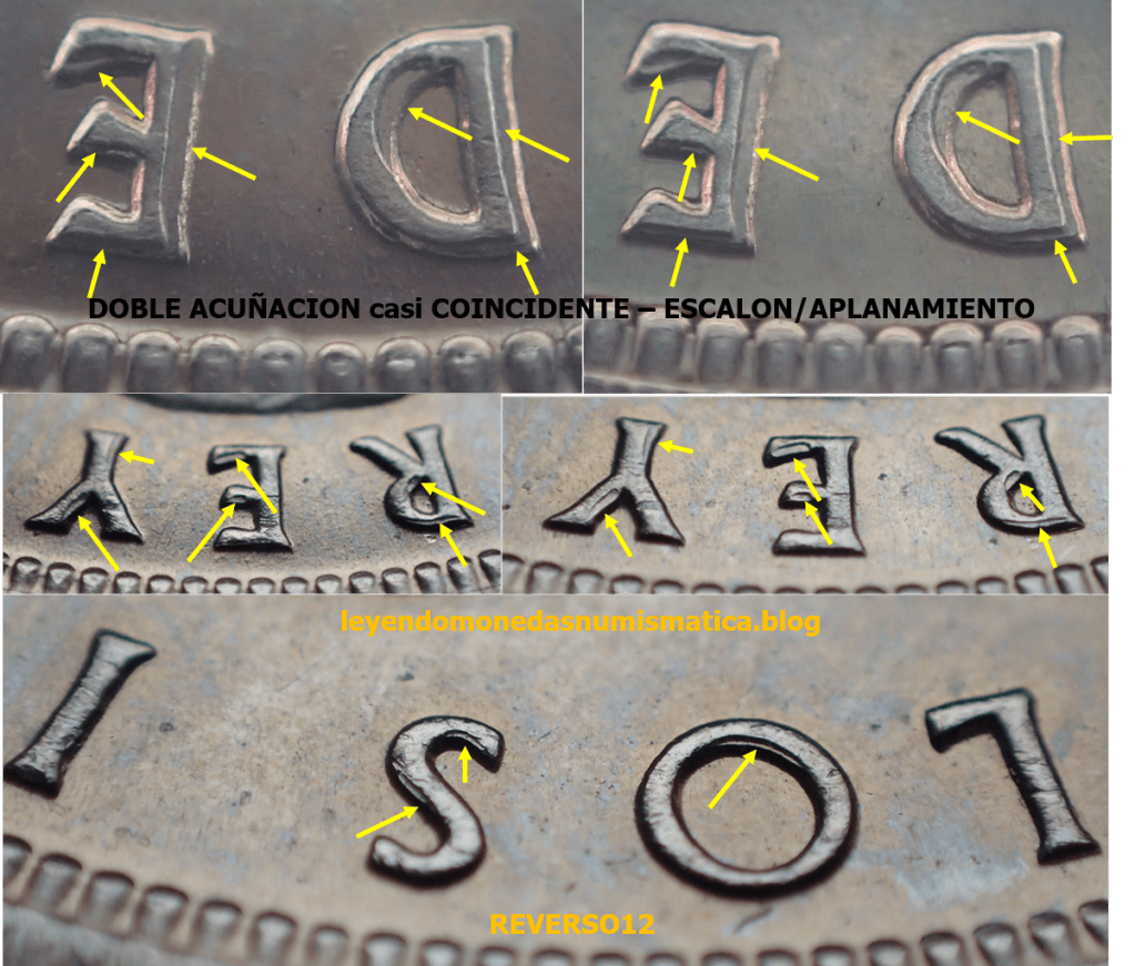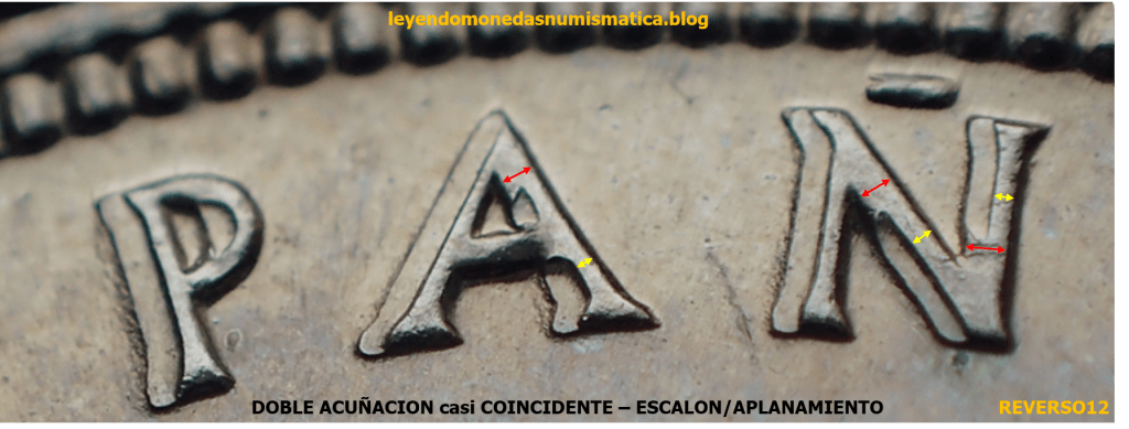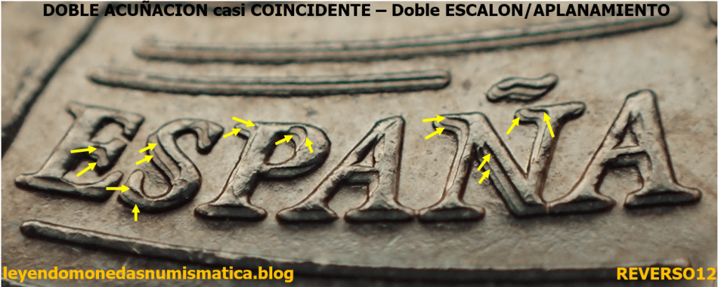 En la imagen ampliada a continuación, se aprecia claramente el escalón/aplanamiento. Hay dos alturas en el relieve (escalón). El relieve superior no afectado por la Doble Acuñación, y el relieve inferior, que es el área aplastada (flujo de metal). Las dobles flechas muestran el tamaño del relieve. Las dobles flechas de color rojo, son mayores en largura, a las dobles flechas amarillas. El color rojo señala el tamaño del relieve de la moneda tipo. La doble flecha amarilla muestra el tamaño del relieve tras el segundo golpe. Por ello se dice, que una Doble Acuñación disminuye el relieve. Comparando monedas se puede apreciar. Comparar los relieves de una moneda acuñada sin error (moneda tipo), y los relieves de una moneda que ha sufrido Doble Acuñación.
