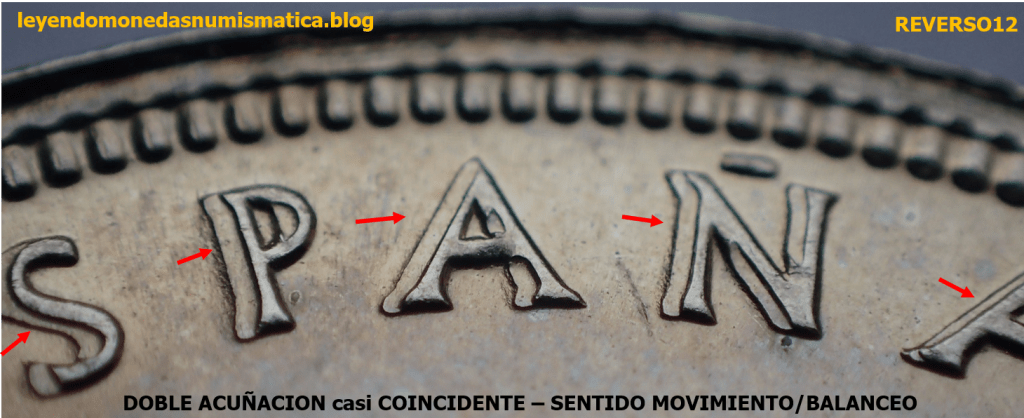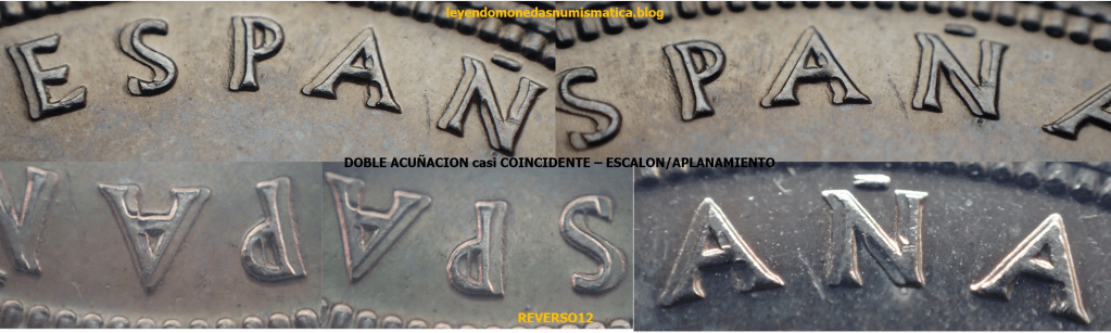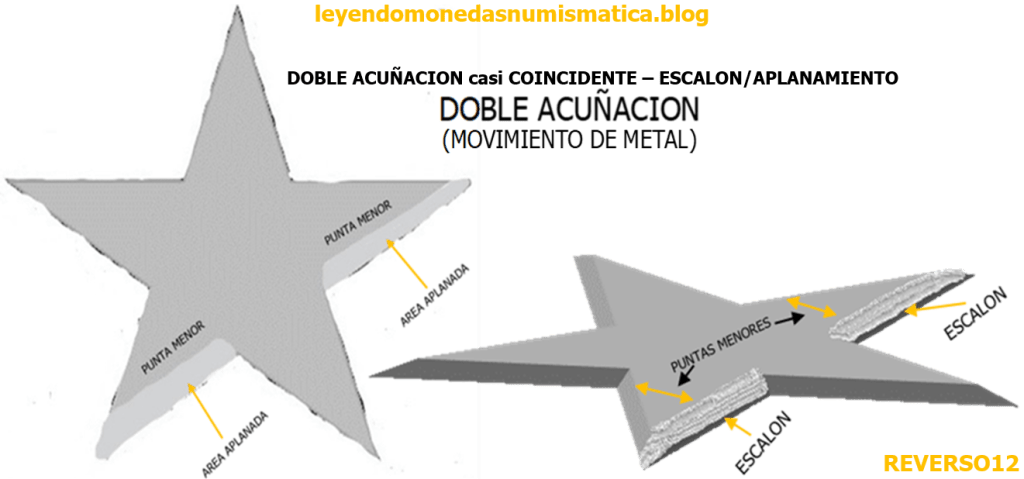 La Doble Acuñación casi Coincidente se produce dentro de la Cámara de Acuñación. (Ver ¡El caldo de cultivo!. 1 Céntimo de Escudo de 1867. Barcelona. LA CAMARA DE ACUÑACIÓN (Virola/Listel). ). Es decir, los golpes que recibe el cospel son dentro de la Virola. En principio, se podría decir, que el cuño Móvil (superior) es el causante de que la Doble Acuñación afecte a una cara, y que si afecta a ambos lados de la moneda, fue el cospel el que bailo/balanceo/giro, deslizo…pueden ocurrir ambas situaciones a la vez. Suele deberse a la vibración o la inestabilidad, que afectan al troquel o al conjunto del troquel. El cospel recibe mas de un Golpe de Acuñación. Como hay un ligero balanceo, en al menos una de las caras, no coincidirá los golpeos del cuño sobre el cospel. En el primer golpe, el cospel recibe las improntas/motivos/diseños en relieve del cuño (bajorrelieve). Es el blanco del cuño (área del cuño superior y lisa, sin ninguna impronta), que golpea los relieves previamente acuñados. Al hacerlo, aplana el área donde coinciden el blanco del cuño y el altorrelieve de la moneda. Como el balanceo es pequeño, ese área aplanada no será muy grande, y producirá, en el borde del relieve un escalón (aplanamiento). Hay dos alturas, el relieve superior producido por el bajorrelieve del cuño, y el relieve inferior, que es el área del relieve aplastada por el cuño (blanco) en prensa.