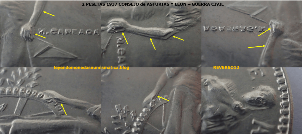 2) MAYOR TAMAÑO DE LOS BAJORRELIEVES: el golpeo del cuño aumenta los bajorrelieves en la acuñación final. El bajorrelieve de la moneda esta en altorrelieve en el cuño, por ello, al balancear el cuño/Cospel, los altorrelieves que chocan con la moneda de nuevo, dejan de nuevo su impronta, dando como resultado un aumento en el tamaño de los bajorrelieves acuñados en la moneda. Esto se aprecia muy bien en la estrella, donde los dígitos están en bajorrelieve.