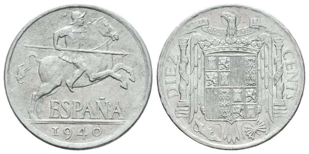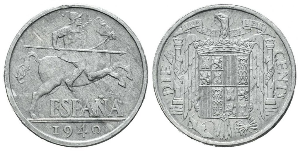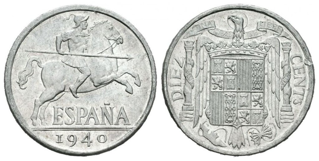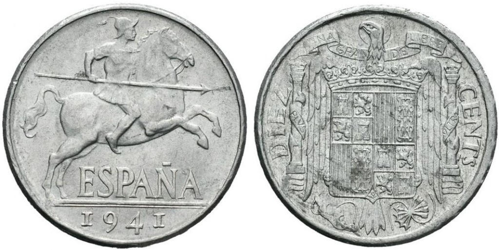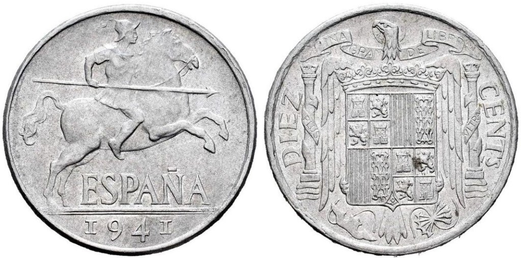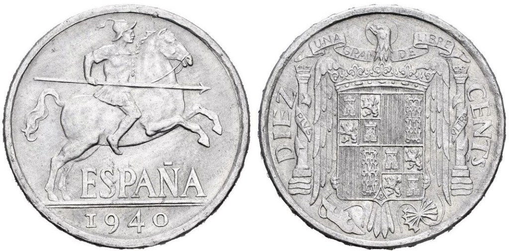 En ese contexto de permanente y necesaria búsqueda de nuevas fuentes de metales –y para las necesidades del país en general, no sólo para las de acuñación- podríamos enmarcar la expeditiva Orden Ministerial de 29 de octubre de 1941, firmada por el ministro de Hacienda Joaquín Benjumea, por la que se decidió “retirar la moneda fraccionaria de bronce acuñada con arreglo al Decreto de 19 de octubre de 1868 (…) quedarán sin valor libratorio, no admitiéndose en las cajas públicas ni entre particulares, quedando prohibida su circulación y tenencia…”. En el inicio de la sustitución del bronce, se había aprobado un año antes la fabricación y puesta en circulación de nuevas monedas de aluminio de 10 y 5 céntimos. En preámbulo de la Ley firmada por Franco el 3 de mayo de 1940, se proclamaba -en todo un alarde retórico- que se efectuaba para remediar el “enrarecimiento de la moneda fraccionaria que tiene su origen inmediato en el (…) dominio marxista”. El resul-tado fue que el viejo motivo del jinete con lanza de los ases y denarios ibéricos regresaba de nuevo a nuestras monedas galopando en el anverso de estas ligeras piezas, según modelo realizado por el grabador de la FNMT Carlos Mingo.