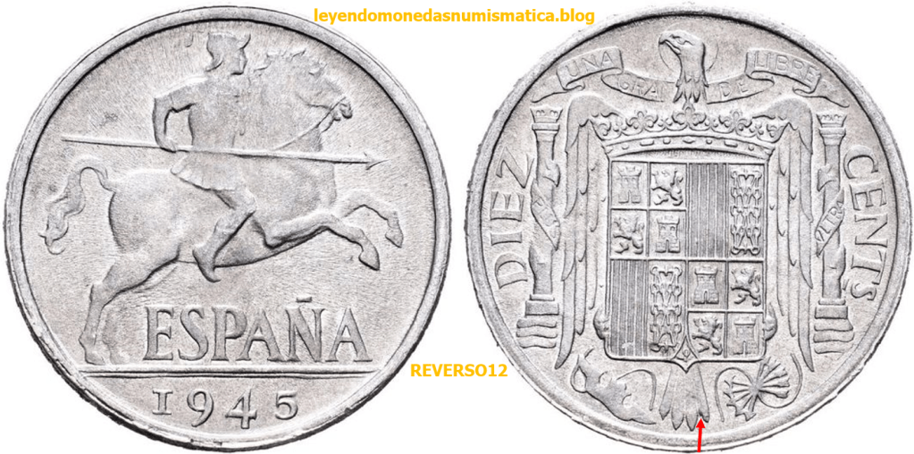 La Matriz de reverso, tiene esa traza/distintivo, y en principio, dicha matriz de reverso genero todos los reversos de los 10 Céntimos con fecha 1940, 1941, 1945 y 1953. Que una matriz presente un distintivo, significa, que todos los cuños que tengan su origen en ella, acuñaran en las monedas, dicho distintivo. La matriz mediante hincado, puede generar mas de un centenar de Punzones de Trabajo. Todos ellos, tendrán ese aspecto/diseño en la cuarta pluma, el cual se reflejara, en principio, en cada cuño obtenido de los punzones de trabajo.