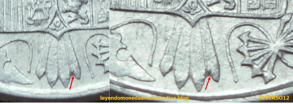 Todas las piezas expuestas, tienen en la cuarta pluma (derecha), en reverso de la moneda, esa traza que señala la flecha roja.