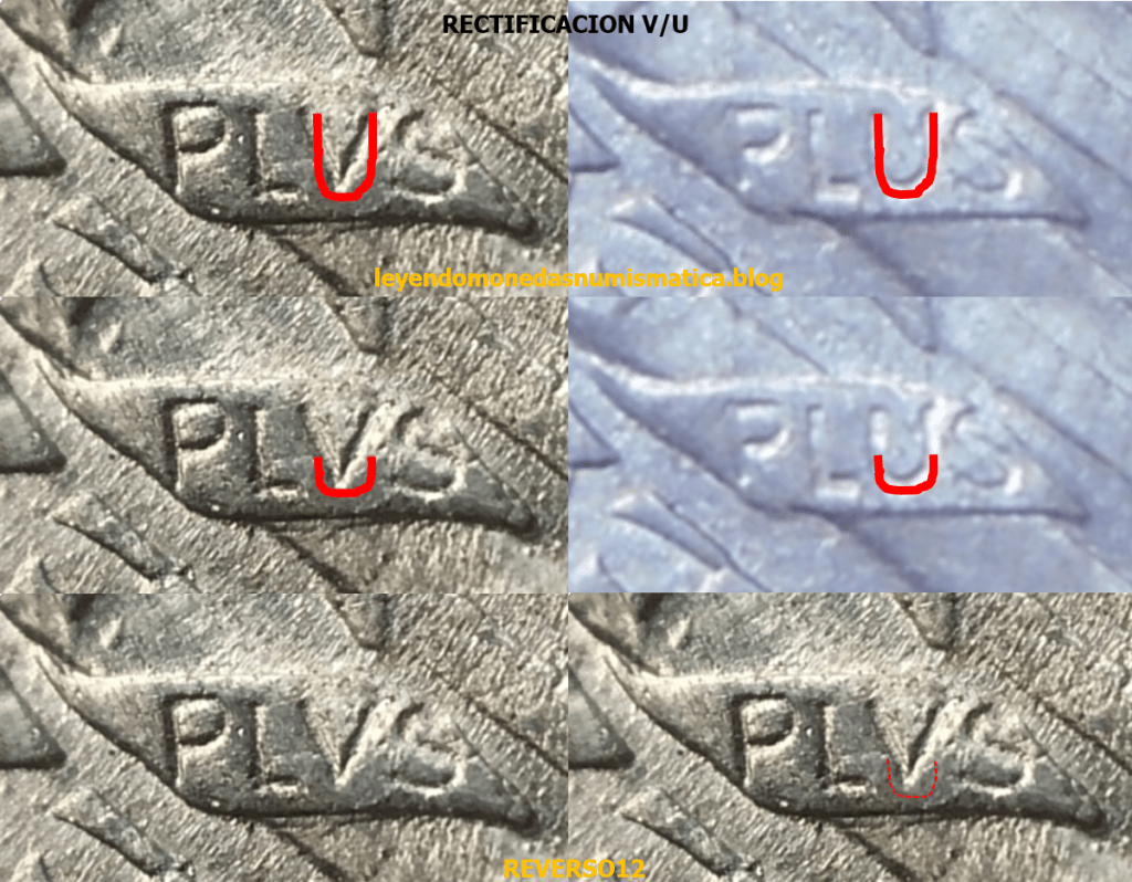 Algunos troqueles que habían perdido el grabado de la letra U, en la leyenda del escudo «PLUS ULTRA», por defecto de fabricación o desgaste, fueron retocados a mano regrabando la letra V en vez de la U, por razones de simplicidad y rapidez. La Peseta Catalogo Básico Jose Mª Aledón.