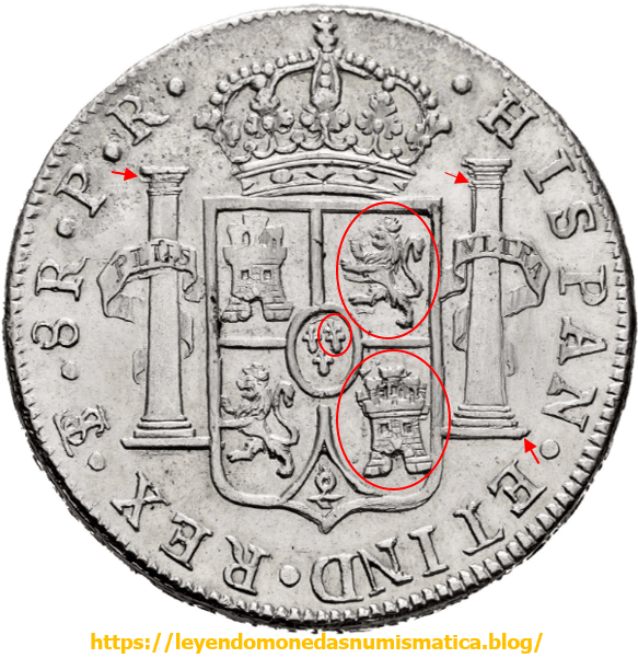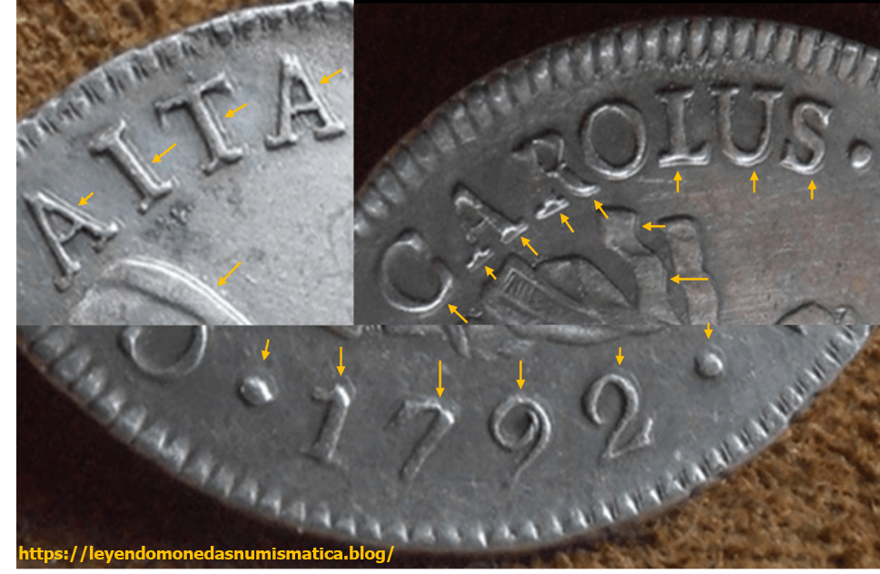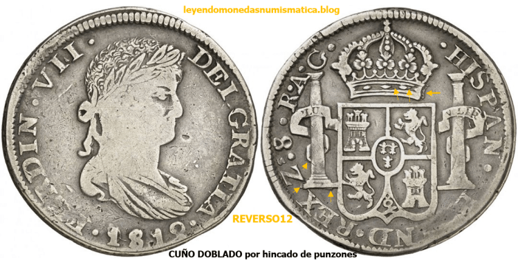 Las flechas muestran el DOBLE contorno. Las flechas nos señalan el desplazamiento del cuño entre el primer golpe y el segundo. Siguiendo el doblado de los relieves, el contorno (flechas), es imposible, que todos los punzones, se hincaran mal (en el cuño) en la misma dirección. El cospel recibió dos golpes de acuñadora, y parte de los relieves establecidos en el primer golpe son aplanados. La no coincidencia de ambos golpes en anverso, origina lo que se aprecia en la moneda. Los relieves superiores, tienden a ser menores en tamaño, respecto al tamaño establecido por los contrapunzones maestros. El cospel, recibía un golpe de acuñación en la prensa a volante sin virola. Ha sucedido algún error, que ha hecho que el cospel reciba dos golpes de acuñación. Seguramente, el cospel quedo fijado a uno de los troqueles después de recibir la (primera) acuñación.