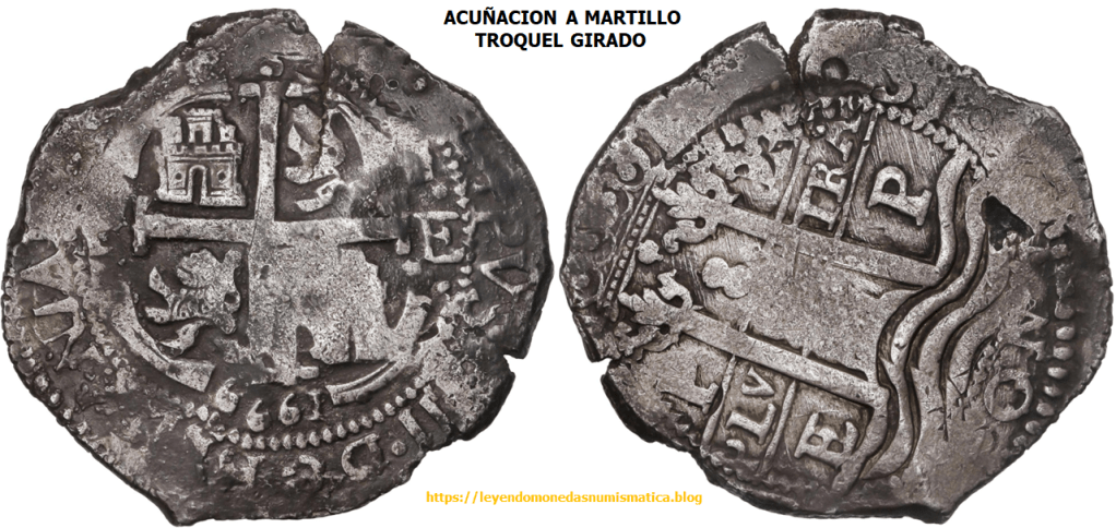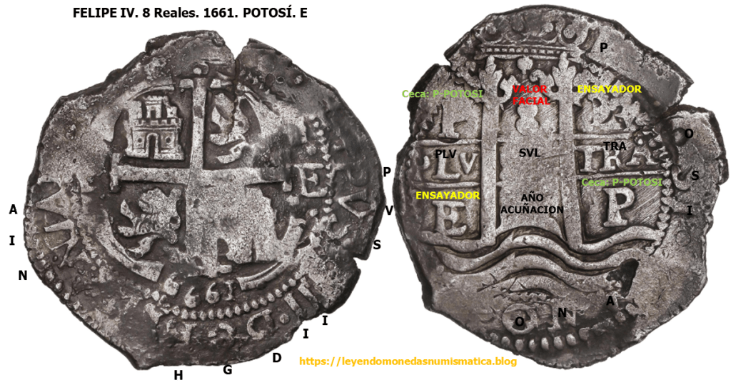 Es difícil encontrar una Macuquina con la leyenda completa. Si la pieza carece de fecha, hay que fijarse en las siglas del Rey ( Mayúsculas /Latín /V en lugar U) y su ordinal. En este caso, las piezas de Felipe IV tienen en los cuños, cuatro IIII ( ordinal del Rey). El ensayador puede ayudar igualmente. El arte de la pieza también lo utilizan los que controlan estas piezas.