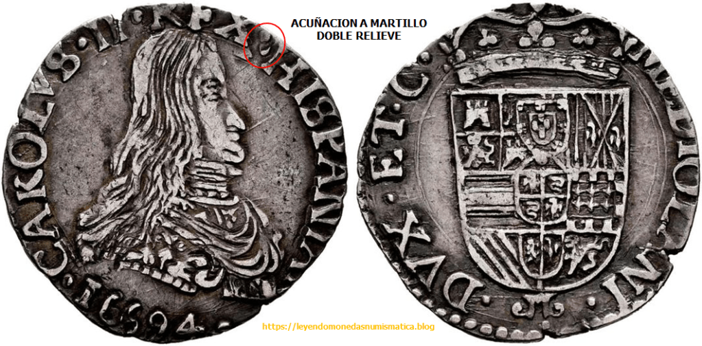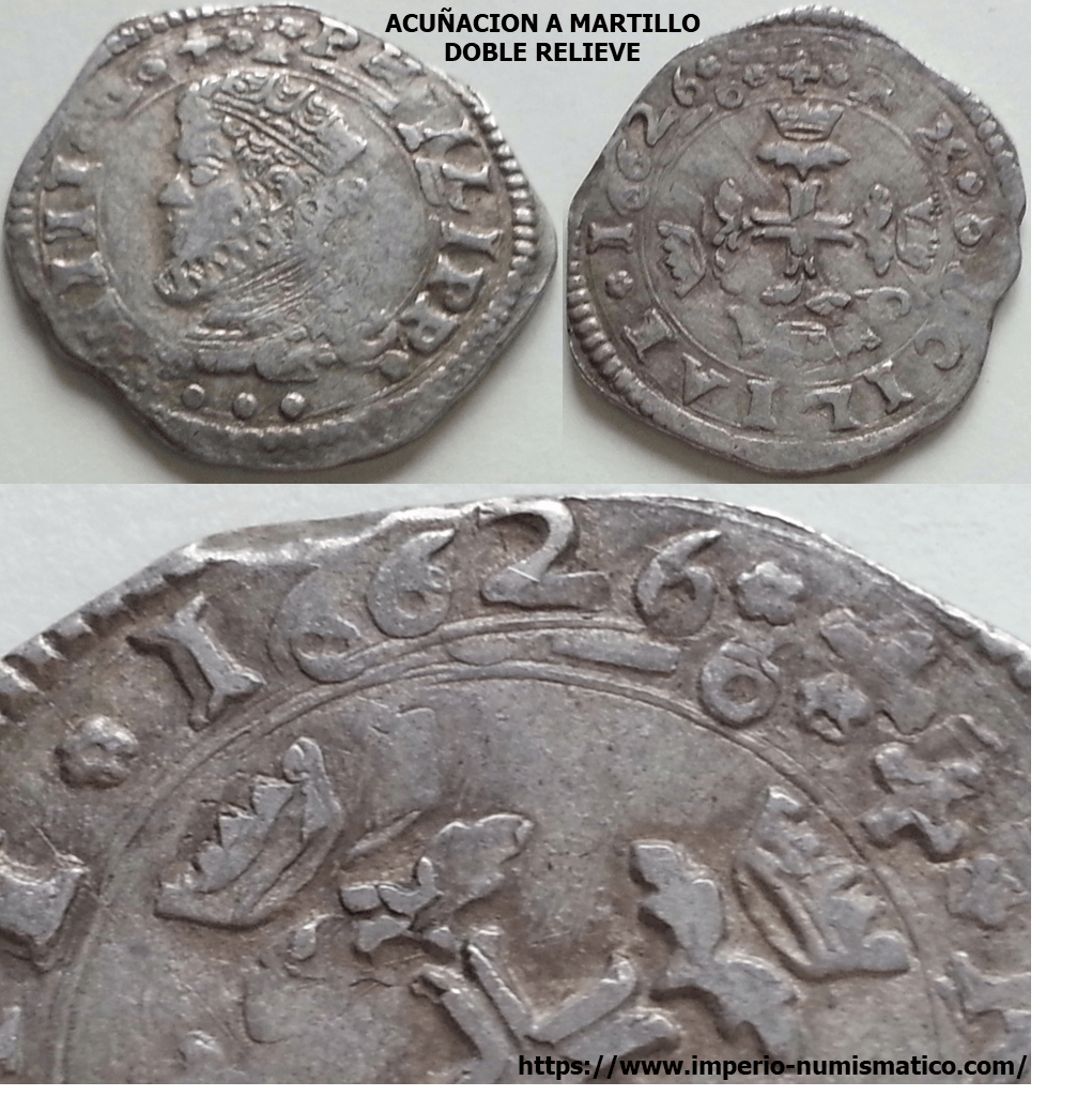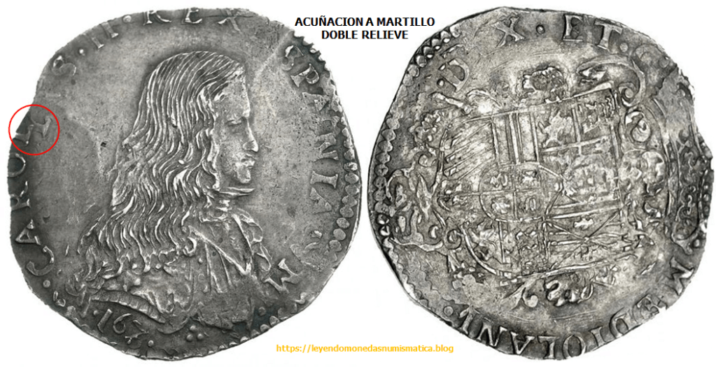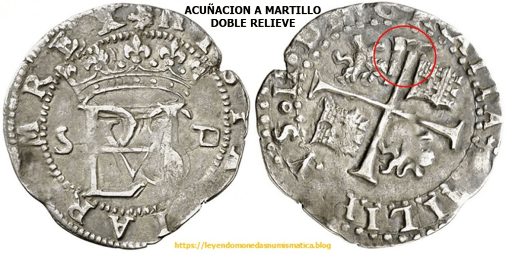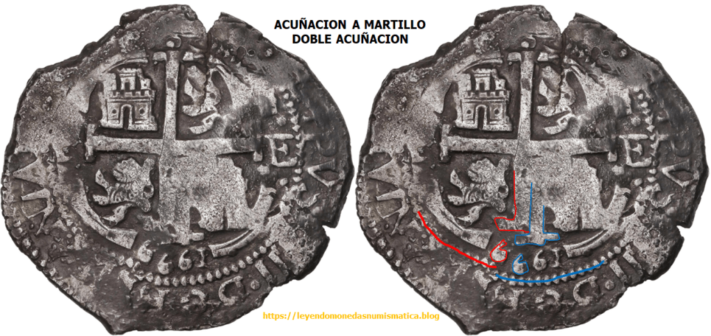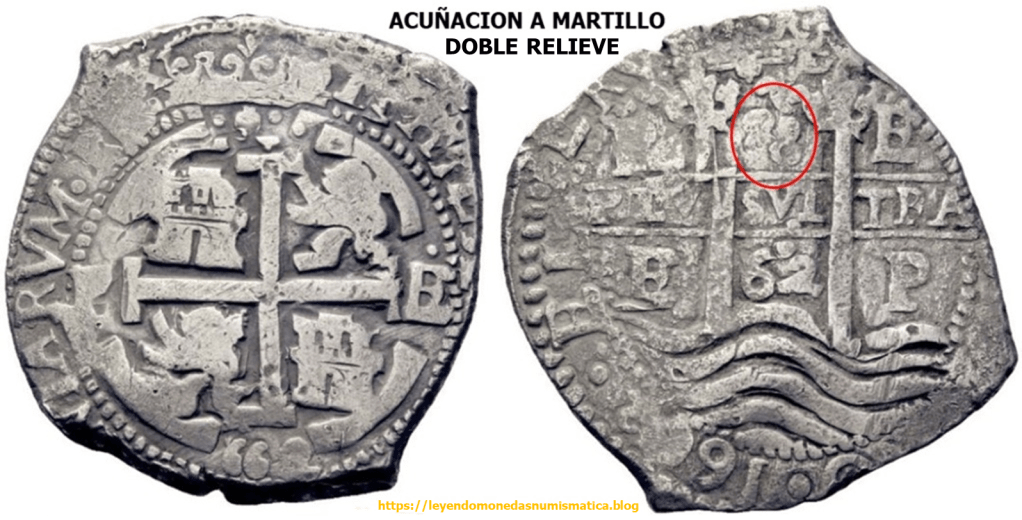 La Doble Acuñación, en la Acuñación a Martillo, puede aplastar relieves previamente acuñados en un golpe anterior. Puede tender a borrar relieves de un golpe previo. Puede incluso, no realzar algún/os relieve del cuño. Pero también puede realzar los mismos relieves dos veces. En el 8 Reales Potosí de 1661, realzó el dígito 6 de la fecha dos veces. En el ejemplo a continuación también realza relieves.