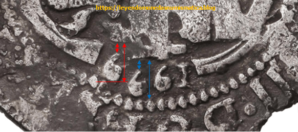 2) Los trazos azules y rojos marcan la posición de tres elementos del cuño. Trazo de cruz, dígito 6 y orla. Los tres elementos del mismo color, están a la misma distancia. Eso es prueba suficiente de que están así en el cuño. Posición y orientación.