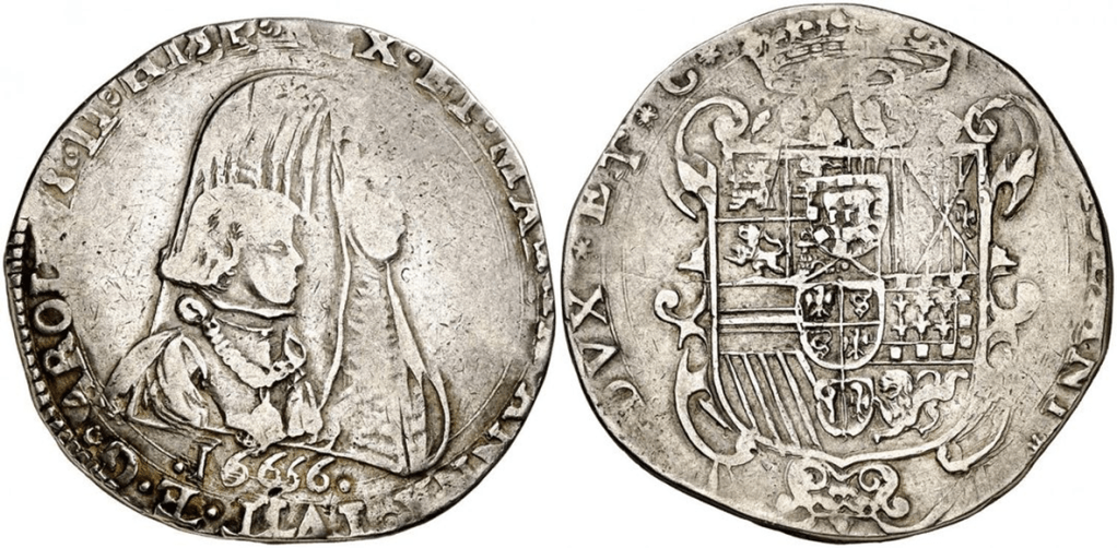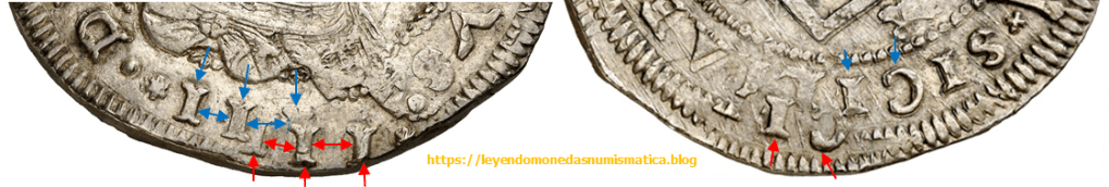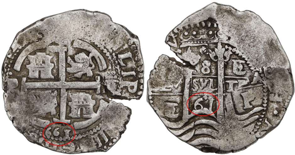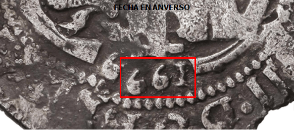 Estas piezas tenían triple Fecha. En el reverso hay dos fechas. En principio, la fecha de 4 dígitos 1661 en la leyenda, y fecha con últimos dos dígitos entre las columnas. En el anverso, la fecha con los últimos tres dígitos (661).