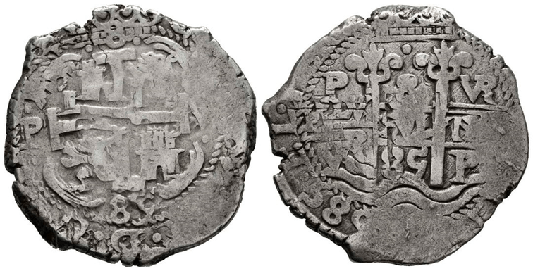 La siguiente pieza subastada, es un 8 Reales del Reinado de Felipe IV, acuñado a martillo en Potosí.