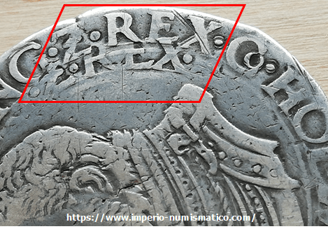 Hay un desplazamiento entre los golpes de martillo, puede ser el cospel o el cuño, pero al no coincidir ambos golpes distanciados, se pueden producir Dobles Relieves, como dos dígitos repetidos, relieves rotos/abiertos como la orla,… A mayor desplazamiento del cuño o desplazamiento del cospel, mayor será el salto entre relieves, distancia. Y al haber un salto (distancia), entre golpe de acuñación (Doble Acuñación), se pueden repetir relieves, perderse a veces otros, y romperse otros como la Orla. Pero en realidad no es que se rompa la orla. Está abierta porque pertenece a dos golpes distintos. Lo mismo que el Doble 6. Como se lee en la imagen a continuación, el DOBLE 6, delata la Doble Acuñación.