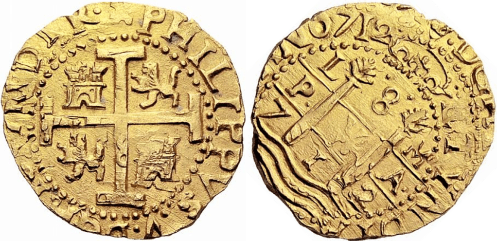 En 1712 mientras la guerra aun continuaba, se acuña en la Ceca de Lima (L) una preciosa pieza de oro, bajo el facial 8 Escudos. A nombre de Felipe V, presenta las dos fechas en reverso claramente visibles(712). El ensayador es, Félix Cristóbal Cano Melgarejo (M).