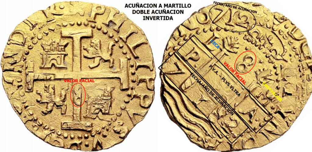 El cuño de reverso se desplazo durante la segunda acuñación. La segunda acuñación del cospel previamente acuñado, muestra otra Doble Acuñación evidente en el reverso. Se aprecian relieves rotos/abiertos, fruto del desplazamiento del cuño durante el golpeo de martillo. EL RELIEVE ROTO/abierto en la Acuñación a Martillo. La Grafila/Orla no cerrada. Los trazos rojos muestran los relieves rotos, como la V de VLTRA en su cuadrante/celda, la orla, y cuadrantes no alineados.