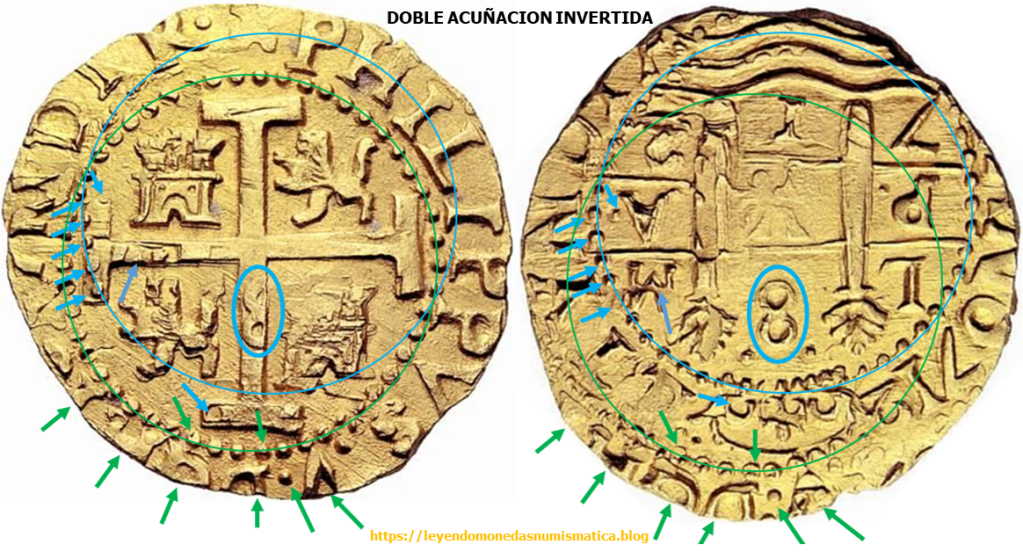 La Doble Acuñación, es un error que se produce durante la acuñación del cospel. En la Acuñación a Martillo, la sufren muchas piezas. Pero hay otra Doble Acuñación, mas difícil de encontrar, la Doble Acuñación Invertida. El cospel sufre una primera acuñación, pero por alguna causa, (el cospel se cae de troquel fijo, el operario no ve una acuñación correcta, …), la moneda vuelve a ser colocada sobre el cospel fijo. En este caso, la moneda se enfrenta con sus altorrelieves de ambas caras, los que haya recibido en su primera acuñación, a los troqueles. El anverso de la pieza recibirá las improntas del cuño de reverso. El reverso de la pieza, recibirá las improntas del cuño de anverso. Se produce una Doble Acuñación de la pieza, pero esta es invertida, al no coincidir las caras previamente acuñadas con los mismos troqueles que las acuñaron.